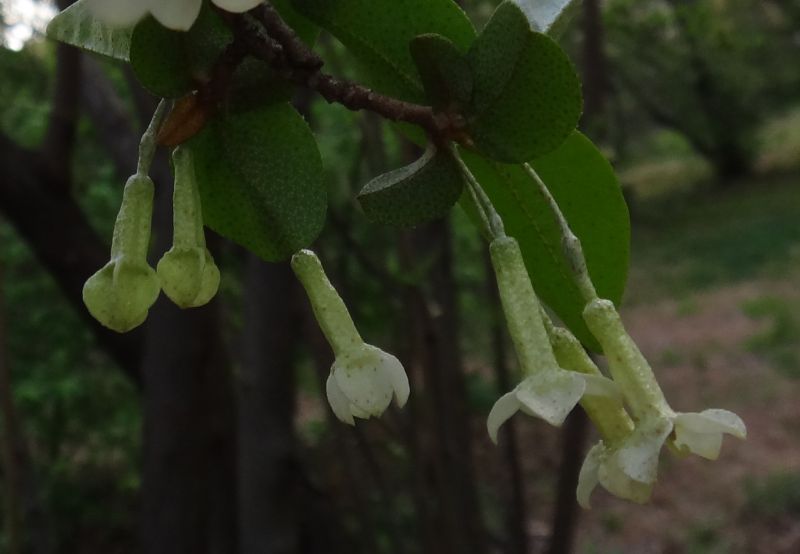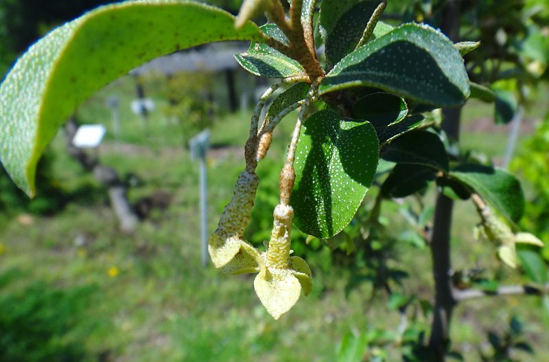 若い葉には銀白色の星状毛が生えるが、のちに脱落して緑色になる。