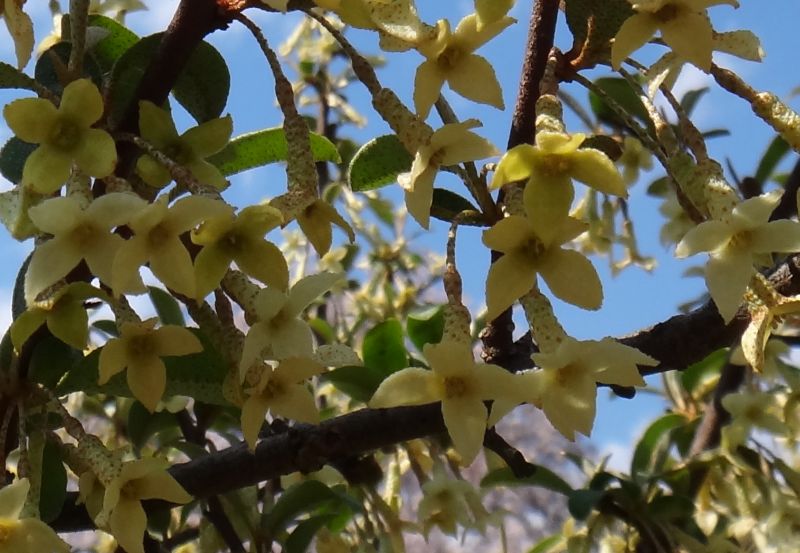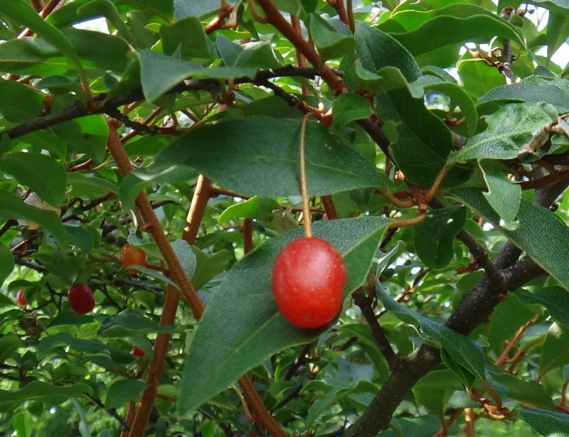 ツルグミ :春に咲き、長楕円形の果実が初夏に実り、枝が蔓状にのび棘がない。