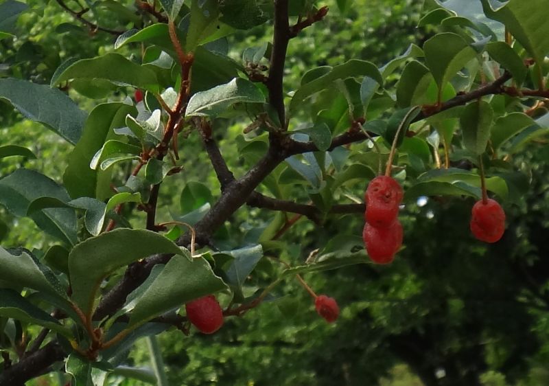 春に花が咲き、初夏に楕円形の偽果が赤く実る。