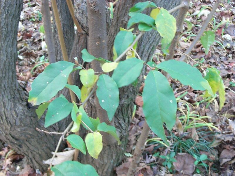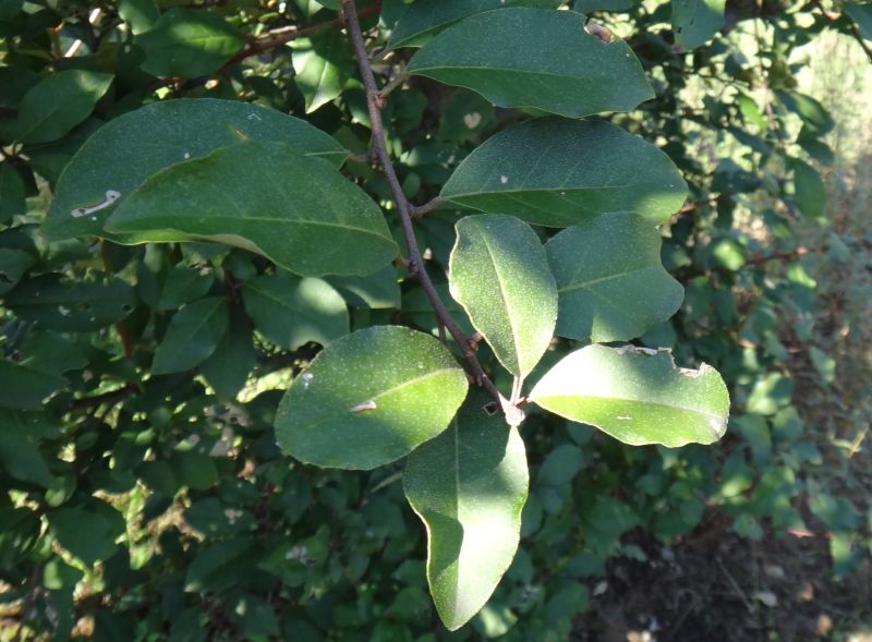 マルバグミ :葉は5〜10センチと大きく、革質で光沢があり、秋に咲き、長楕円形で白っぽい果実が翌春に熟す。