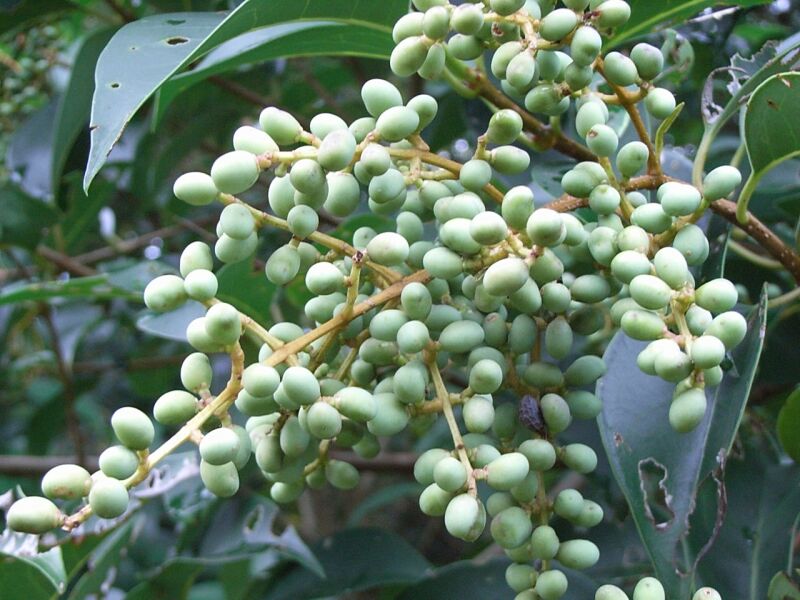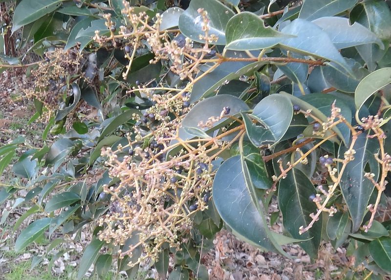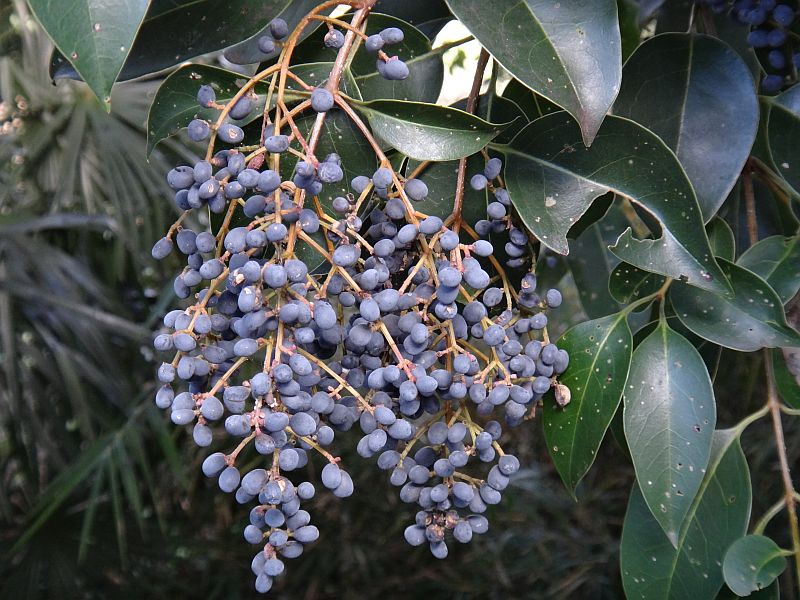 核果はネズミの糞のような楕円体で、冬の初めに熟して黒紫色になる。