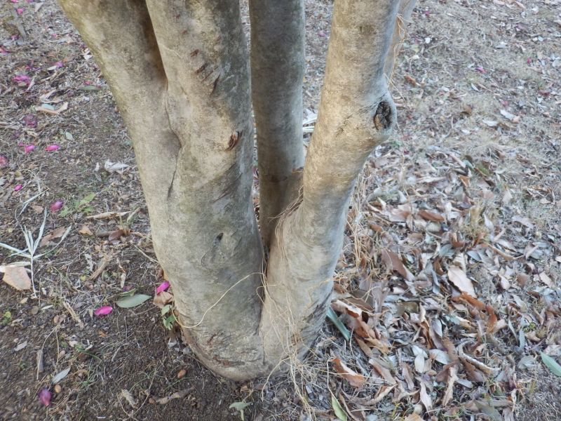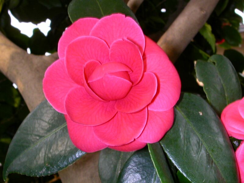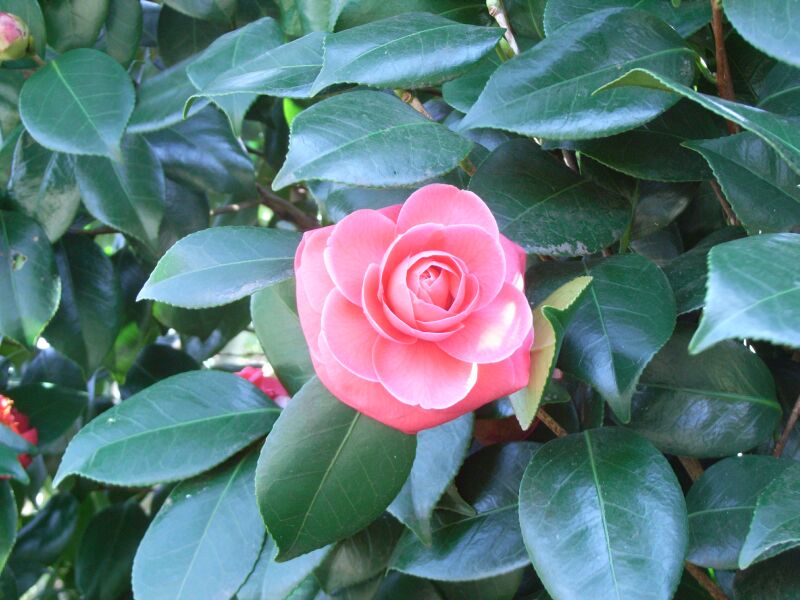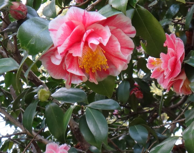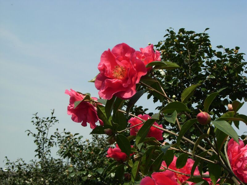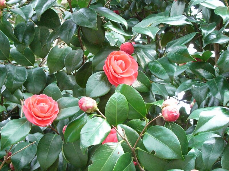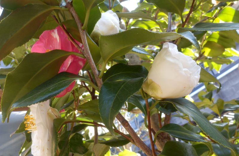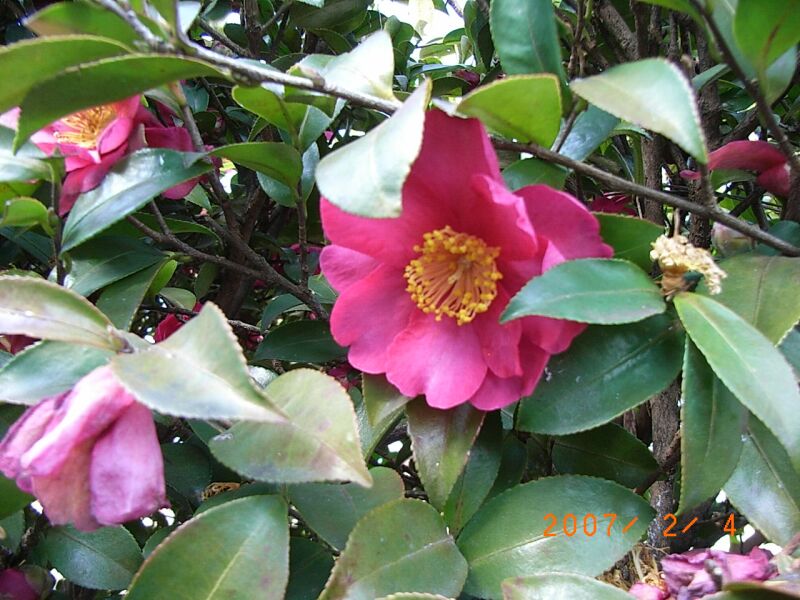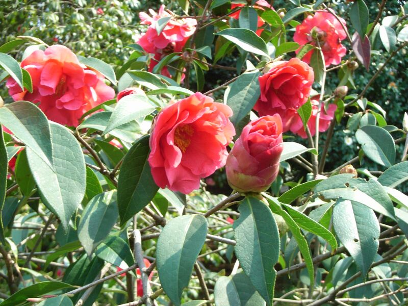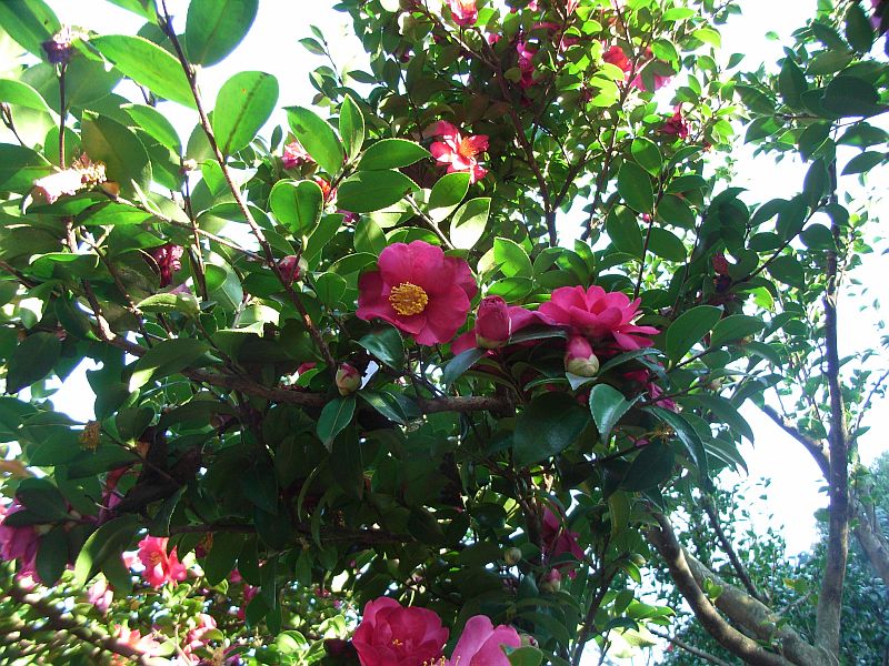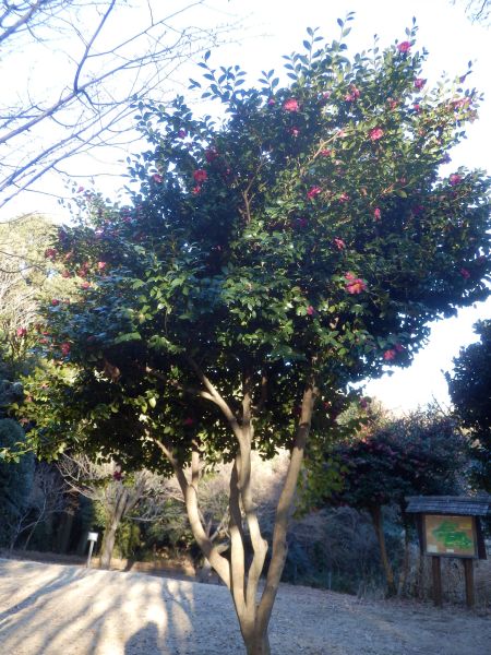 ツバキ :花期は春、花は半開、雄しべは合着、花弁がバラバラにならずに落ちる。