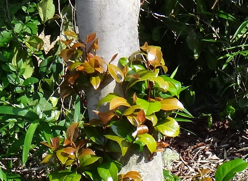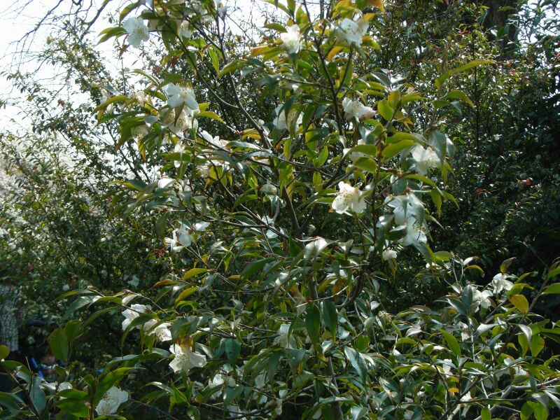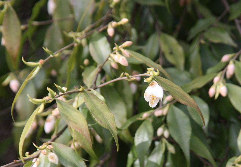 葉先が尾状にとがる。11月〜3月に白い小さい花をたくさんつける。香港原産。