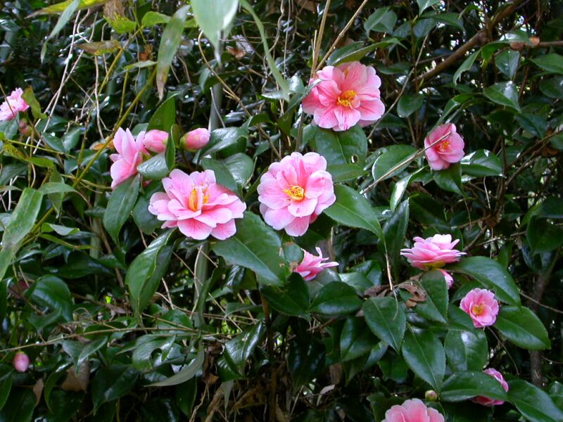 サザンカ:花期は冬、花は平開、雄しべは合着しない、花弁はバラバラになって落ちる。