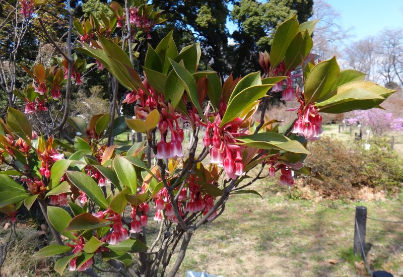 常緑で、早春に紅色の釣鐘形の花が下向きに咲く