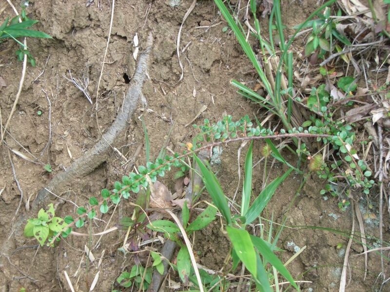 茎は細くて地を這うか少し立ち上がるかし、葉は無柄の楕円形で、