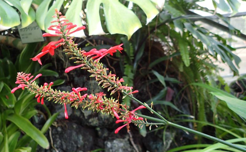 その先の円錐花序に赤くて細長い唇形花を多数咲かせる。