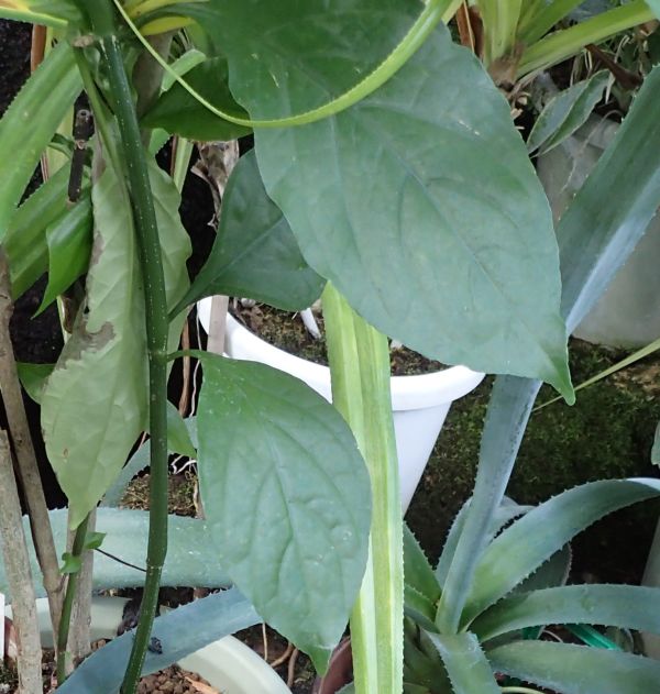 茎は灰褐色で粗面であり、直立後に湾曲する。