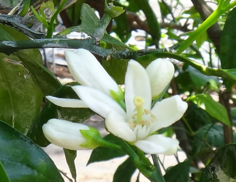 春に枝先や葉腋に直径約4センチの白い5弁花が咲く。