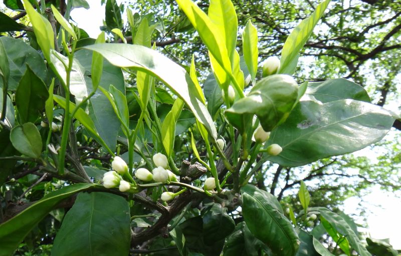 葉は卵状楕円形で全縁、革質であり、互生する。蕾は葉腋に数個つく。