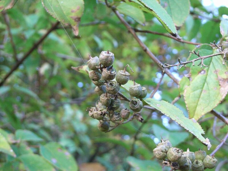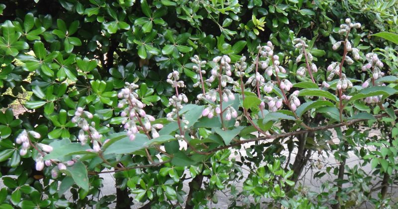 枝先の円錐花序に白い小花を多数下向きにつける。萼筒は短くて5裂し、