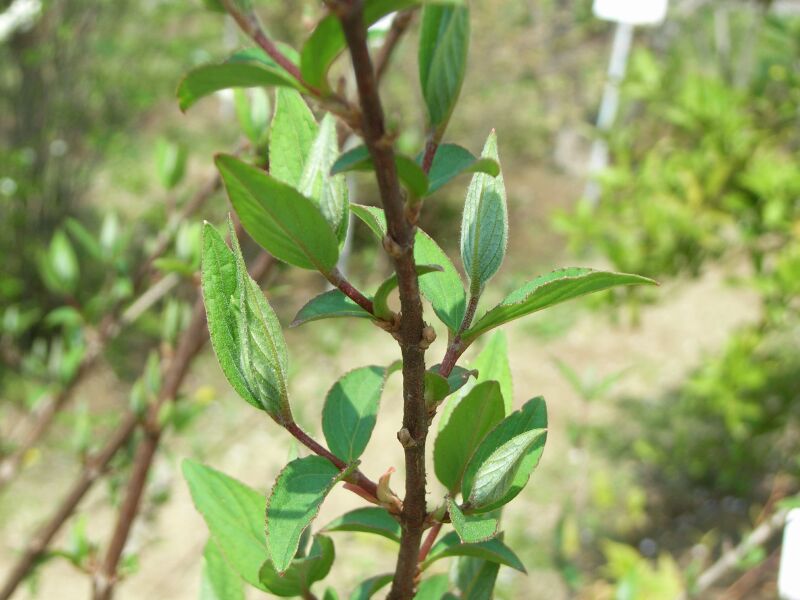 若葉。葉に厚みがある。若枝は赤褐色で星状毛がある。