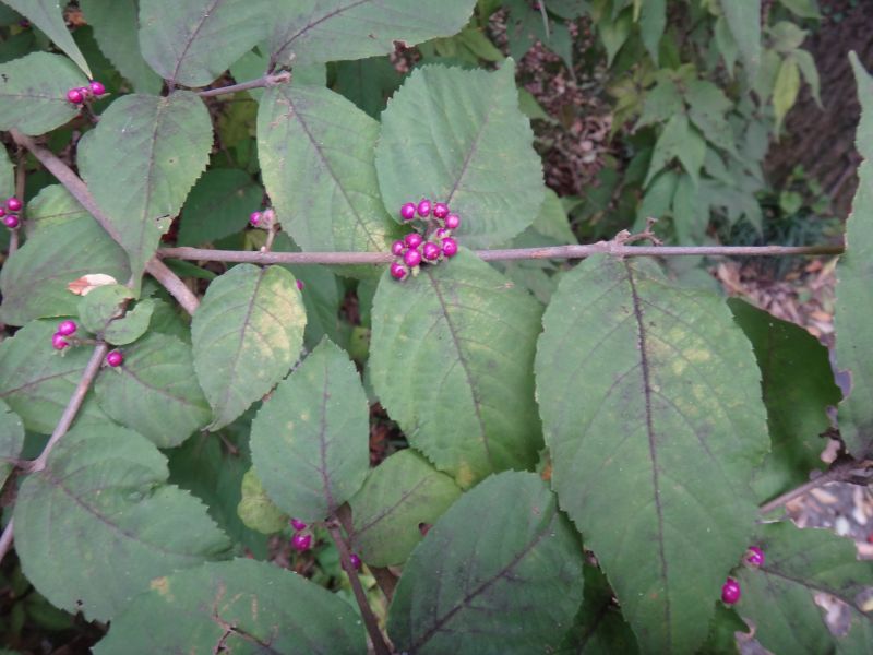 コムラサキ :葉の上半分に粗い鋸歯、花序の柄が葉腋より上につく。実が密。