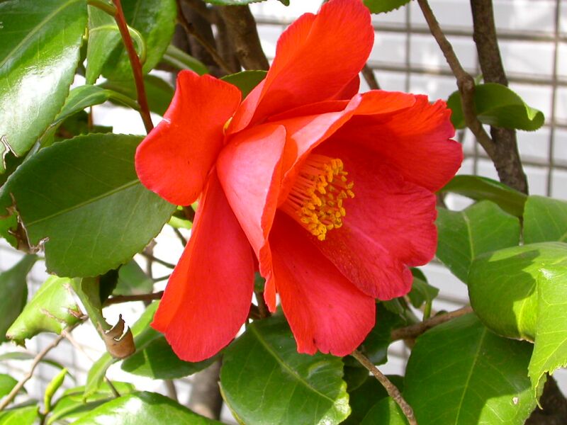 花弁は赤く、黄色い葯のある多数の雄しべは基部が合着している。