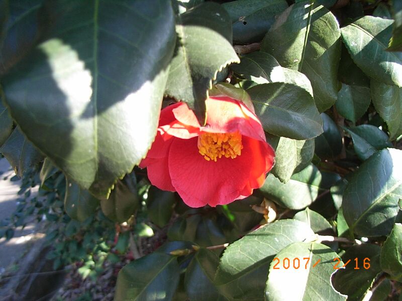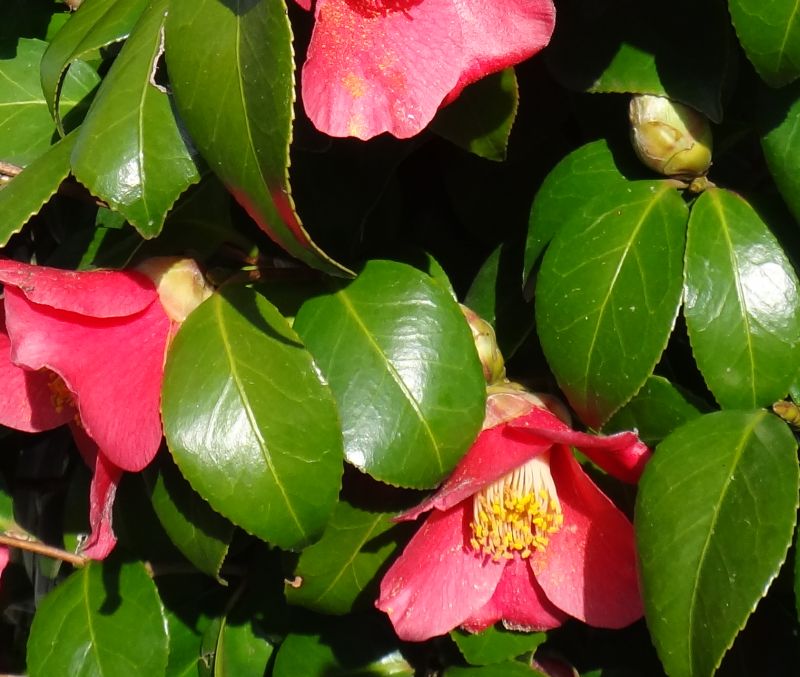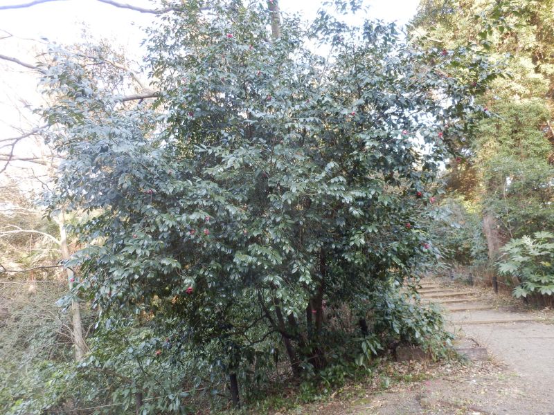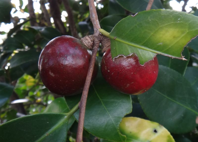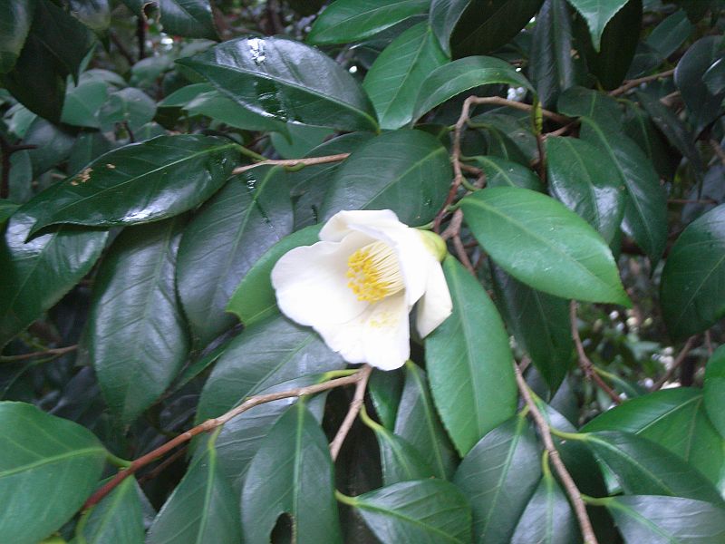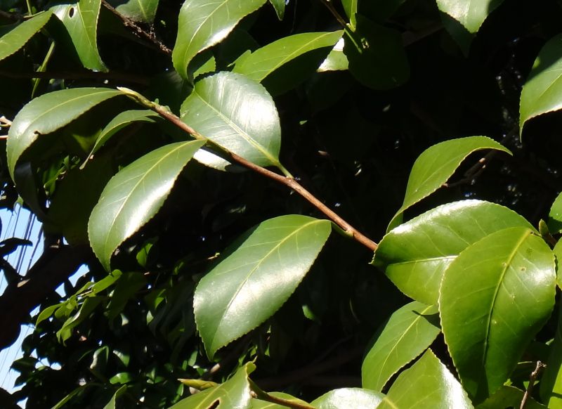 葉は先の尖った長楕円形で鋸歯があり、革質で光沢があり、互生する。