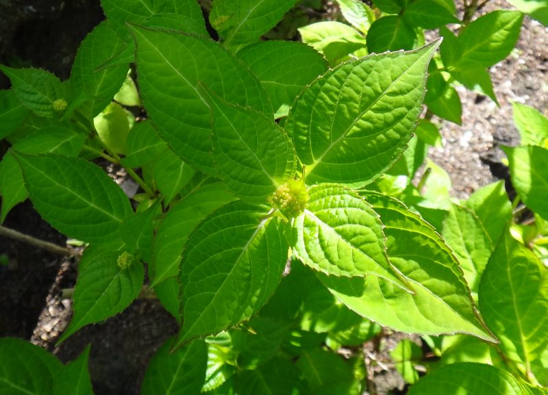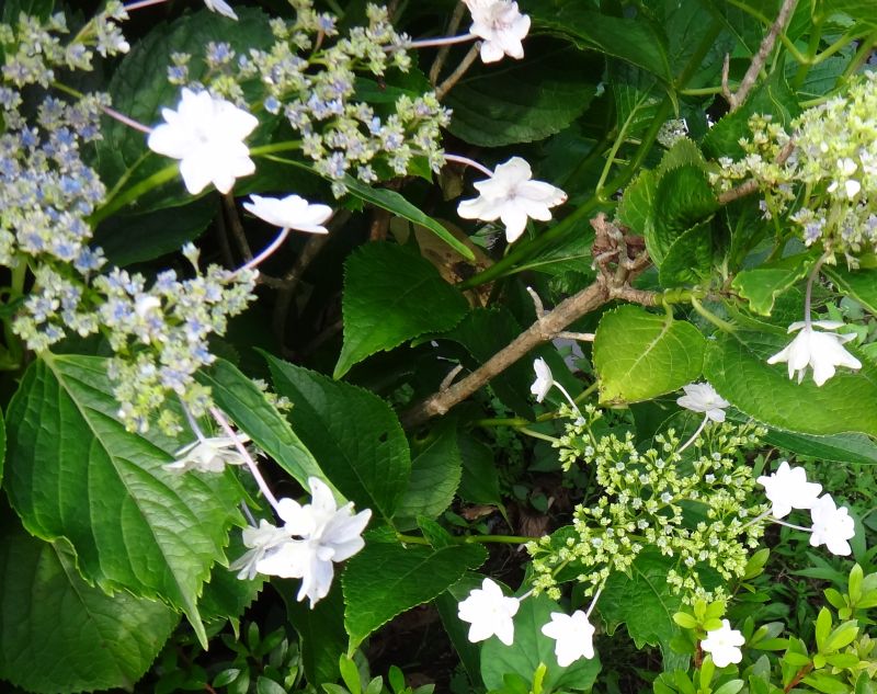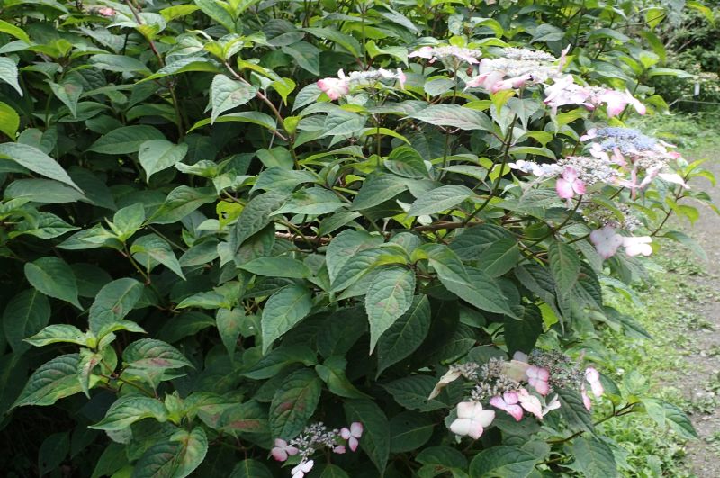 ガクアジサイ:2メートル、葉が丸くて厚く艶あり、短く尖る、花期6月上旬〜7月中旬、海辺を好む。