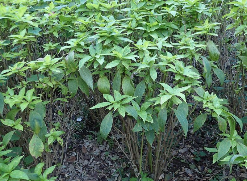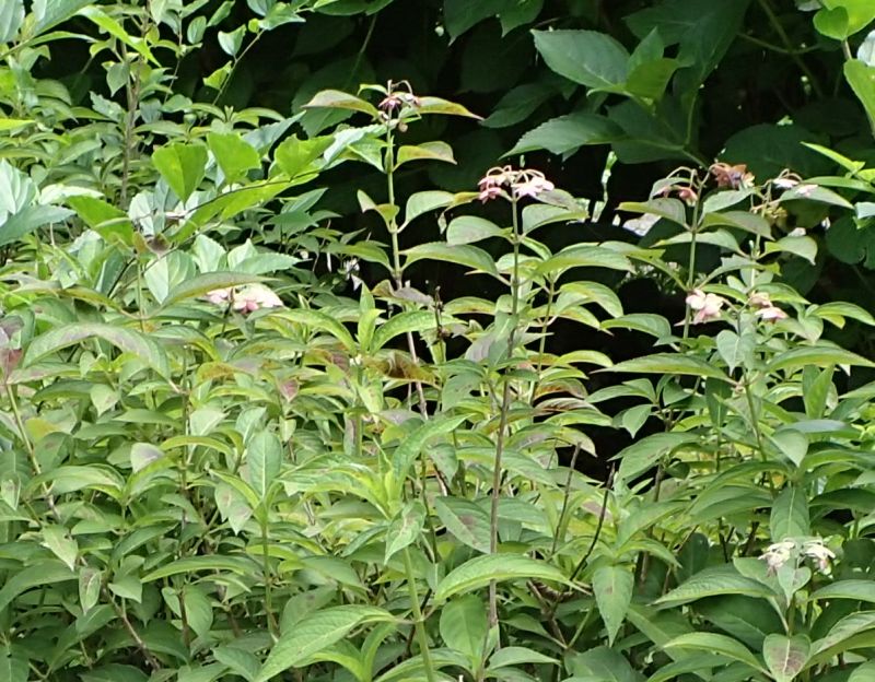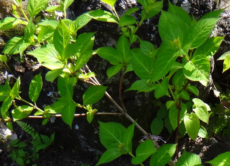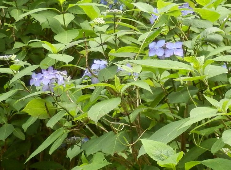 ヤマアジサイ:1.5メートル、葉が細長く薄く艶なし、細長く尖る、花期5月下旬〜6月中旬、山を好む。