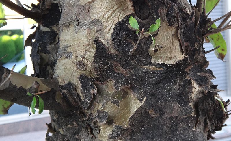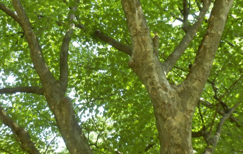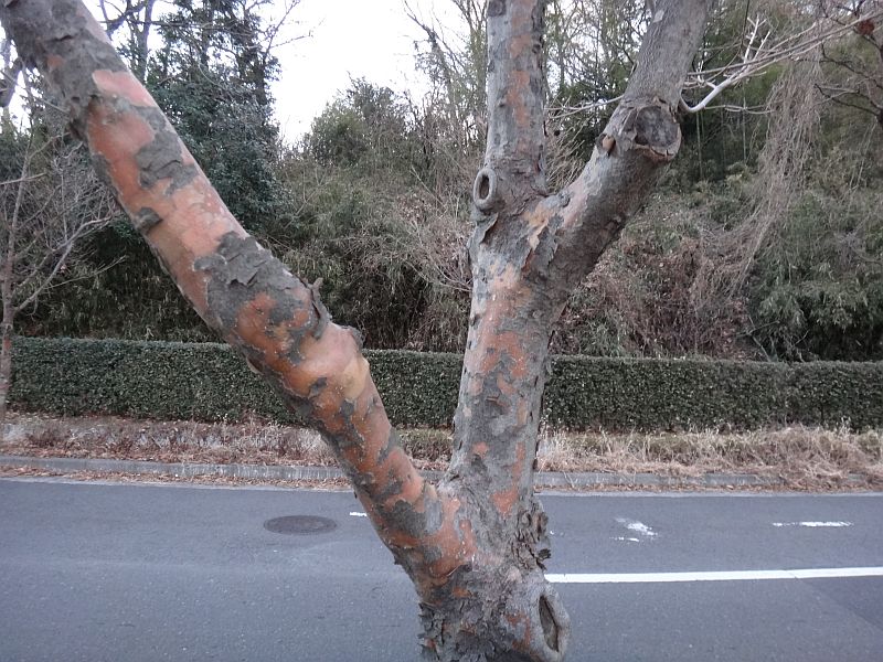 年数を経ると、樹皮はまだらにはげて暗赤色となる。
