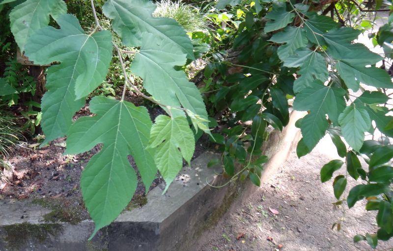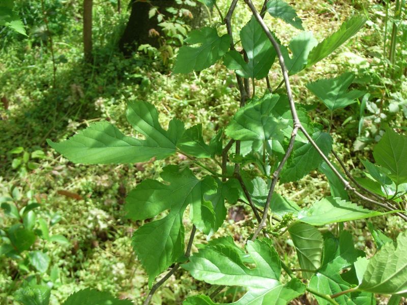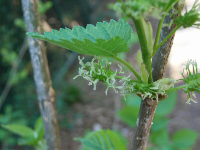 コウゾ :雌雄異株、雌花序毛玉状、雄花序楕円形、実がほとんどならない、低木
