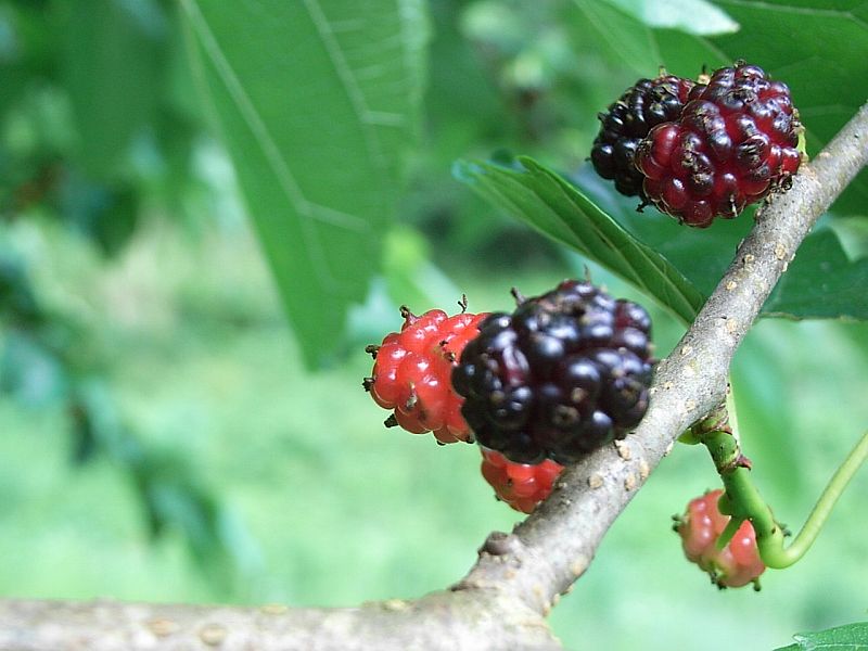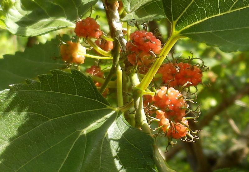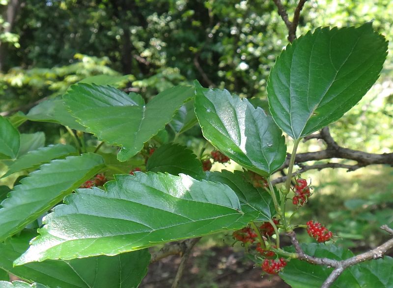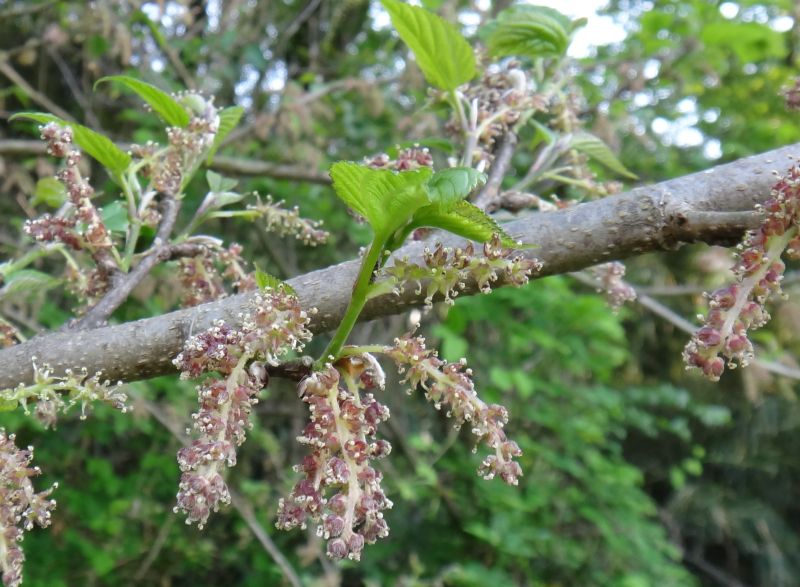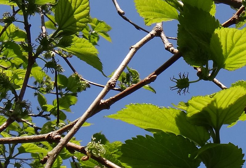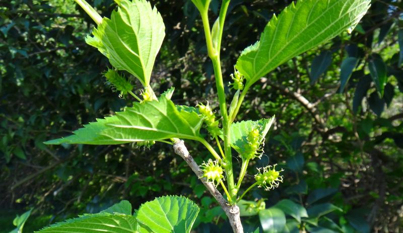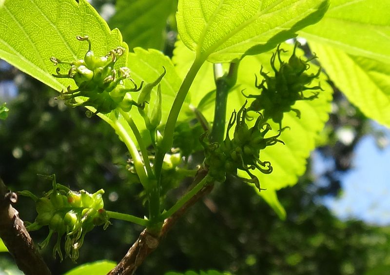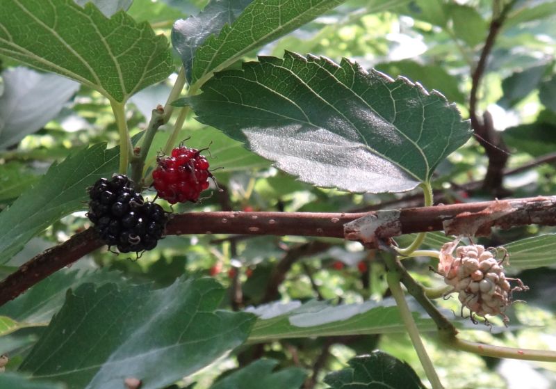 マグワ : 雌雄異株、花柱が短い、雄花序4〜7センチ、楕円形の総状集合果が黒くなる、高木