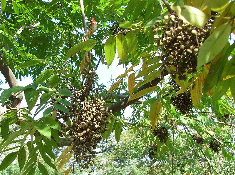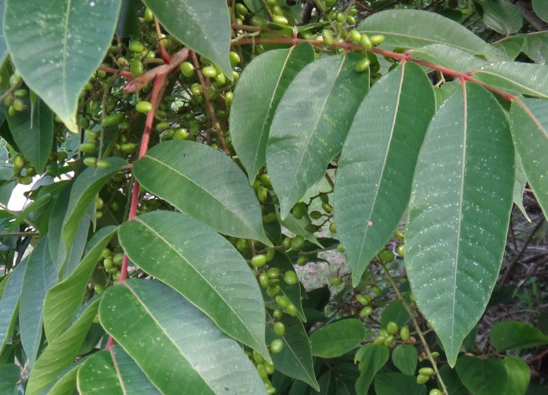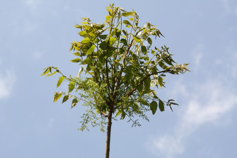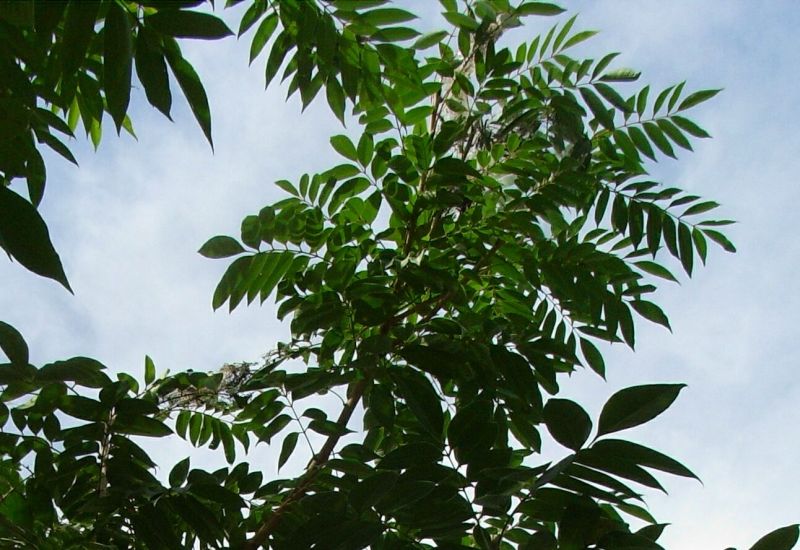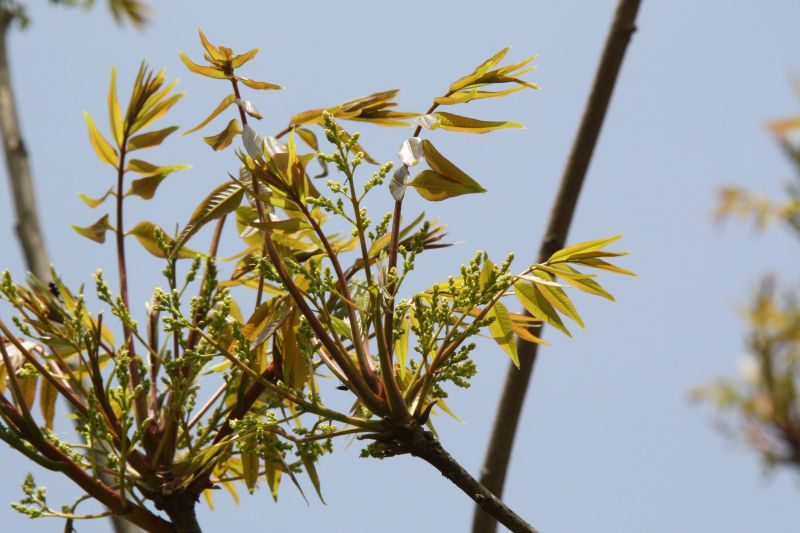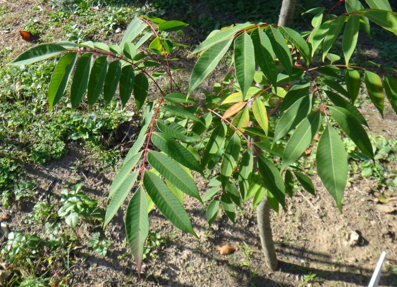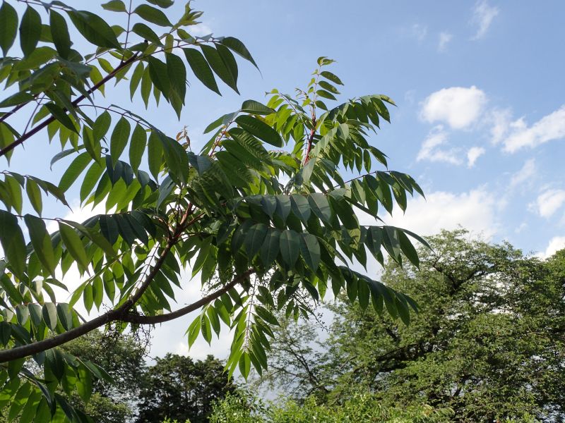 葉は奇数羽状複葉で、小葉は尖った卵状楕円形。若枝は赤い。
