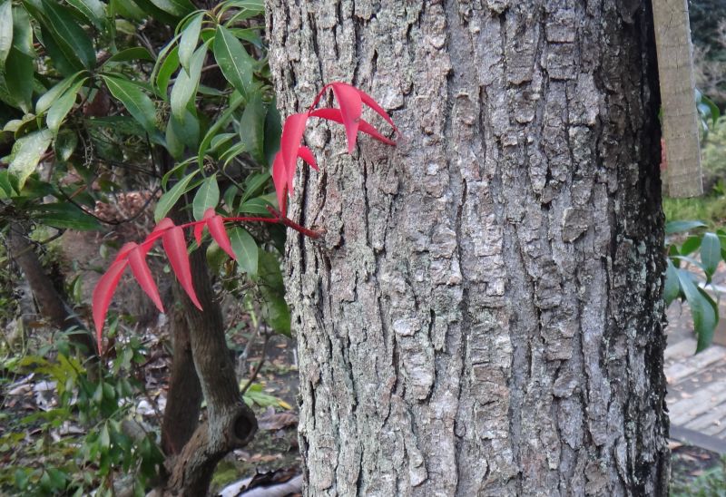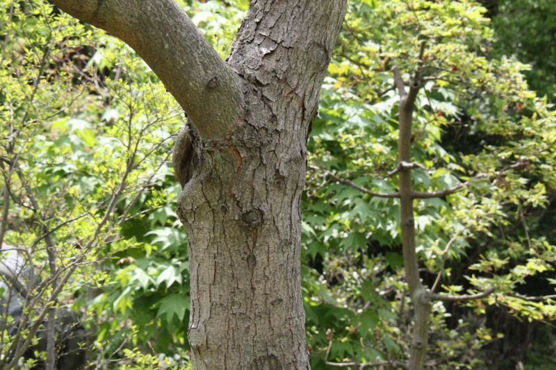 樹皮は褐色で赤褐色の皮目があり、老木では縦長に裂けてはがれ落ちる。