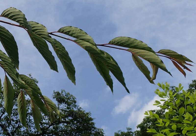 葉は左左右右という形態のコクサギ型互生をする。 葉身は長さ6〜13センチで、先が鋭くとがった長楕円形であり、 裏面は粉白色を帯びる。