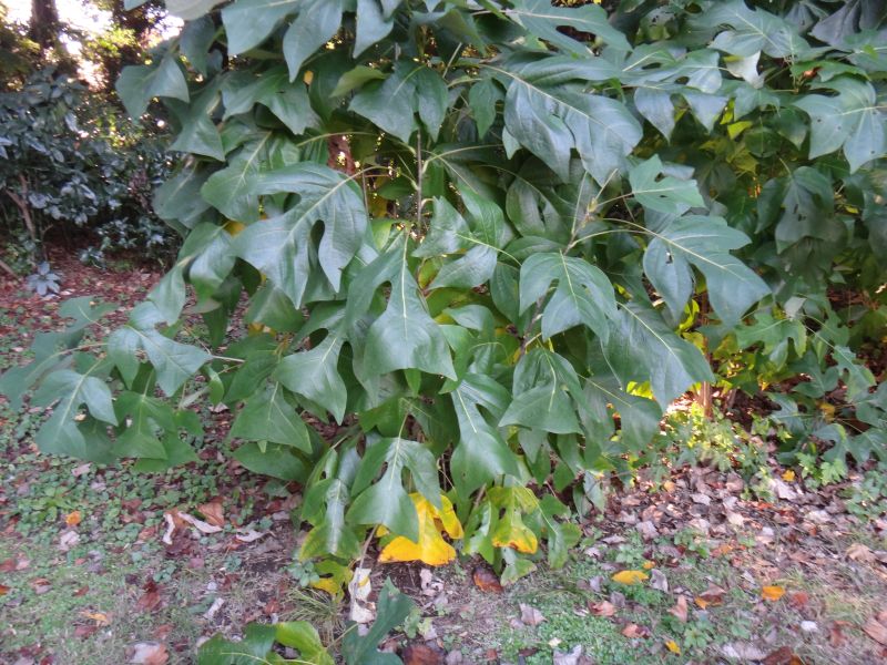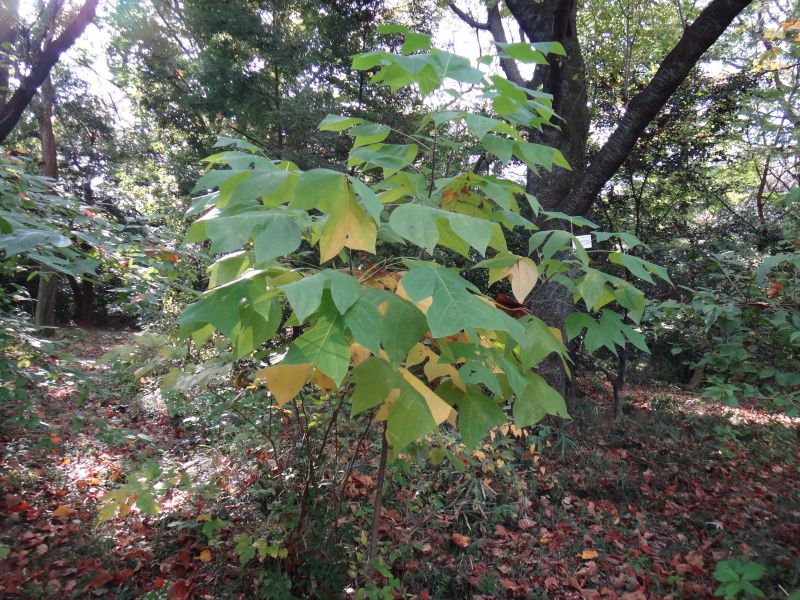 葉は互生し、長さ10〜15センチの掌状で、薄くてかたく、