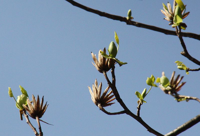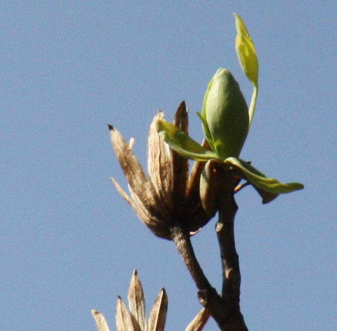 芽鱗が開いて、新しい葉が旗をあげるようにして展開し始めている。