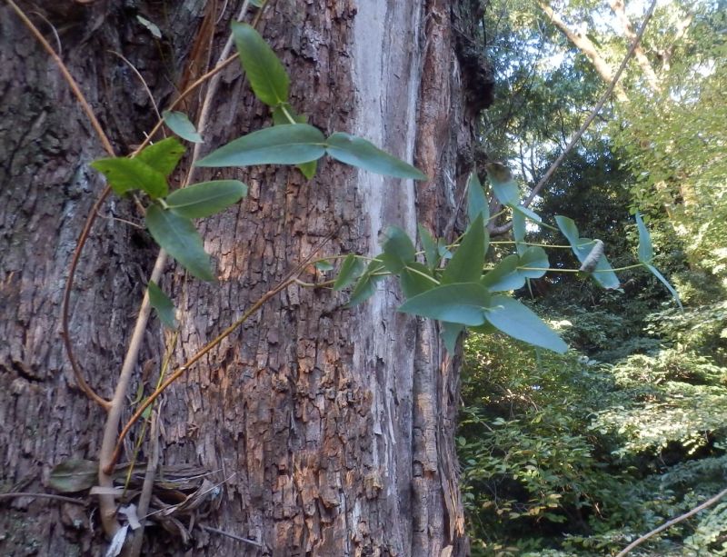 幼樹では丸い葉が対生し、成木では鎌形の葉が互生する。