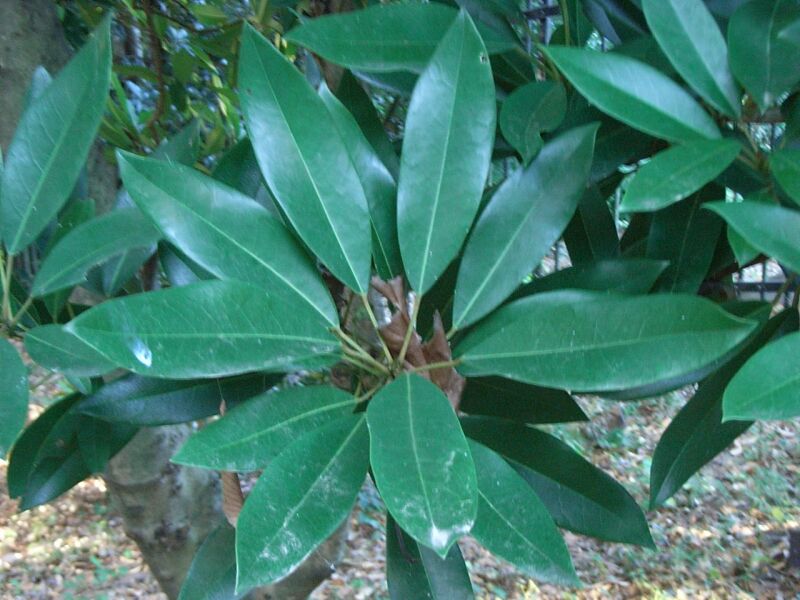 若葉が出るときに古い葉が一斉に落ち、葉は革質で光沢があり、 枝先に集まって互生し、果実は卵状楕円形の核果で秋に藍黒色に熟す