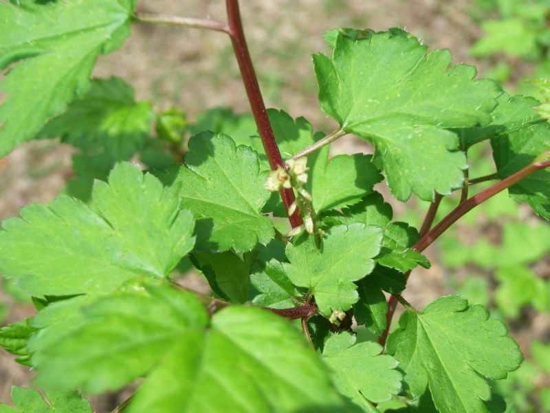 葉は長さ3〜6センチで掌状に3〜5裂して鋸歯があり、