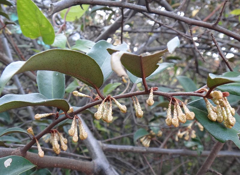 雌しべ1つと1〜3個の雄しべだけで花弁のない花をつける。