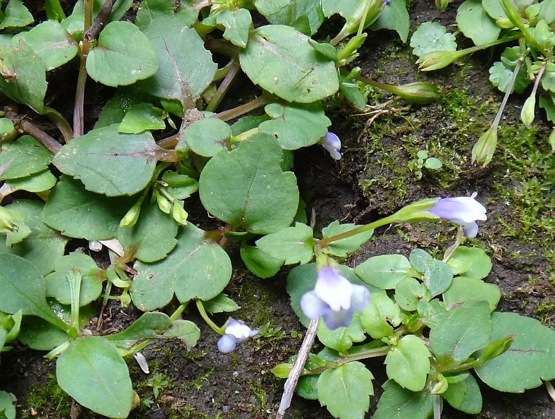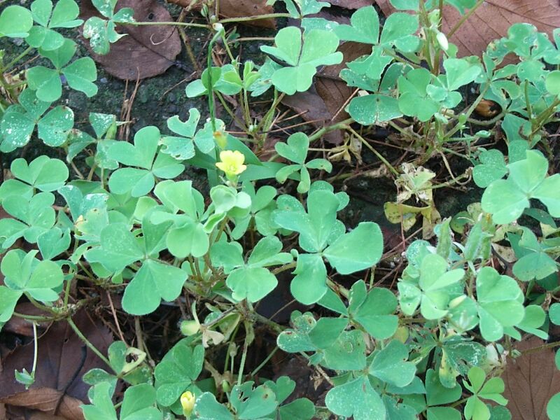 丸い縦状の葉に長い葉柄がつき、花は5弁が多い。