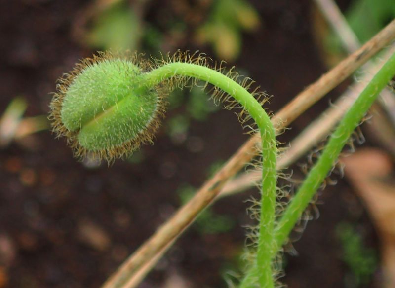 オニゲシ:葉は羽状に全裂し、全体に剛毛があり、蕾は直立し、花は大柄で花弁基部に黒斑があり、宿根草。