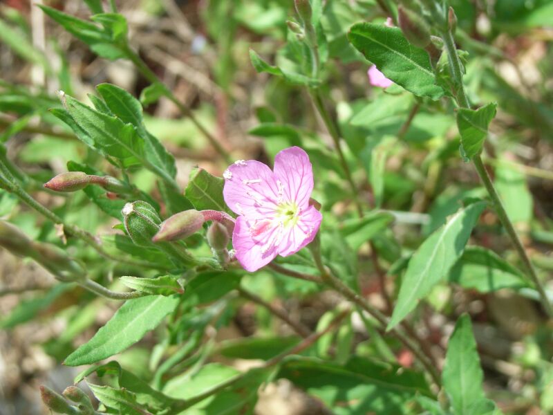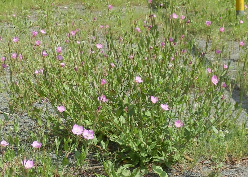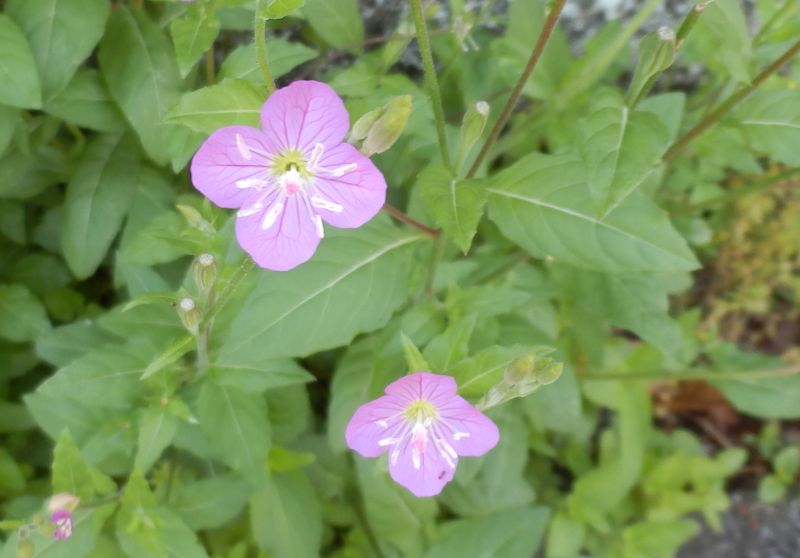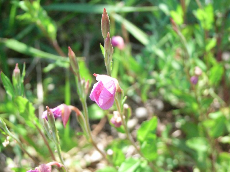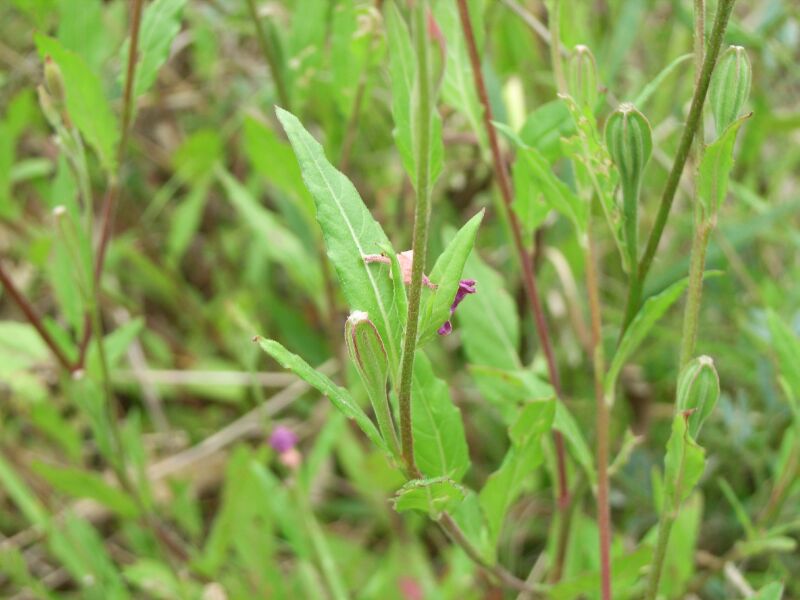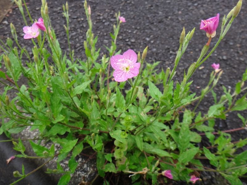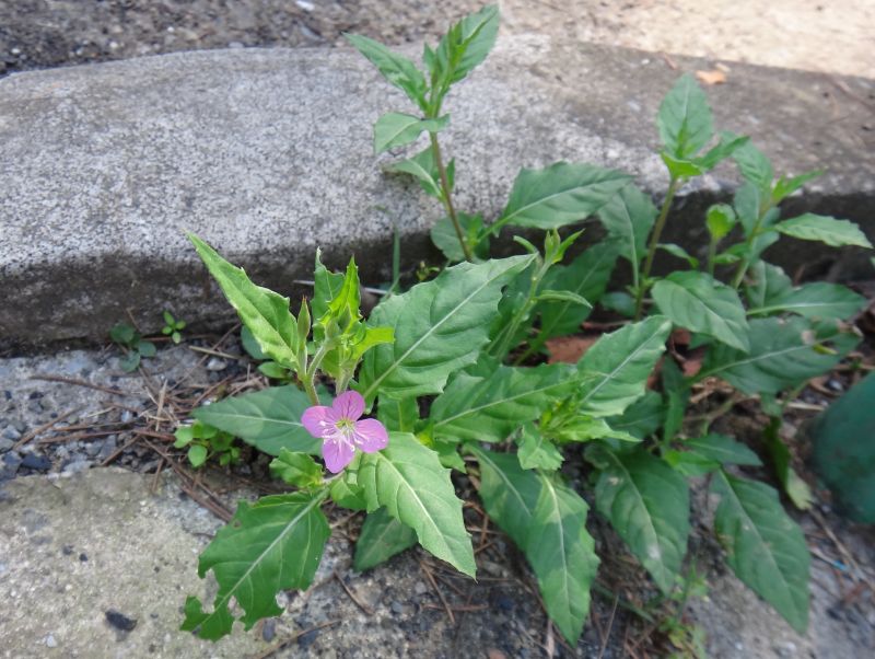 上部の葉腋に直径約1センチの淡紅色の4弁花を数個つける。