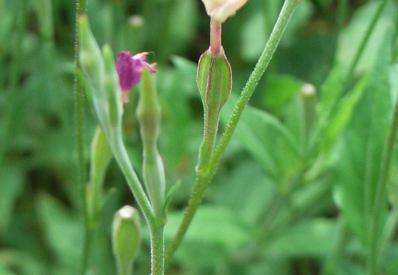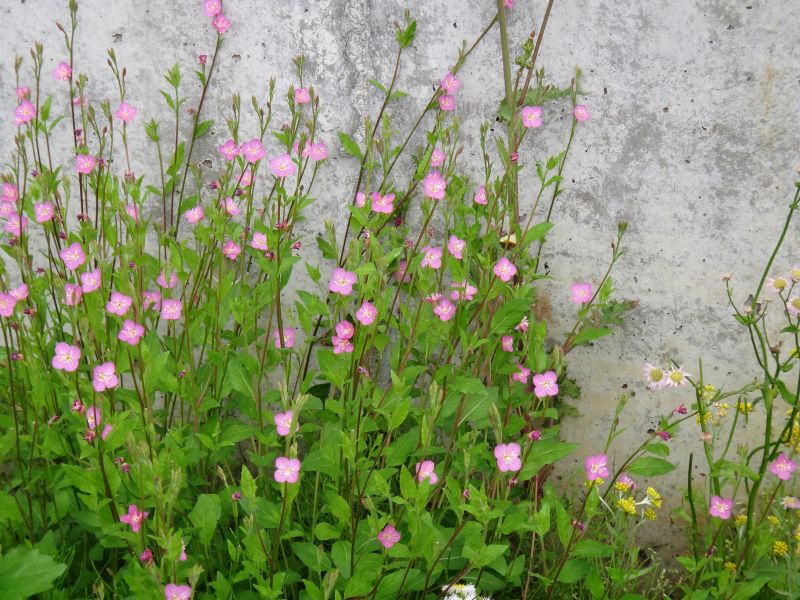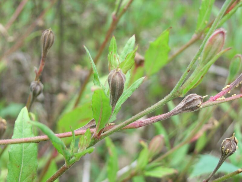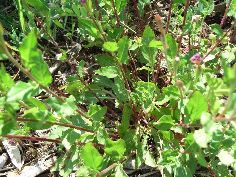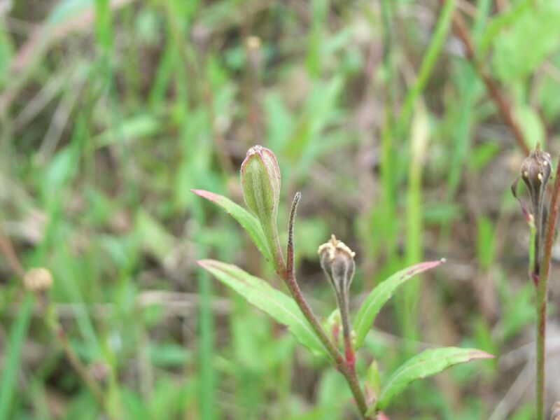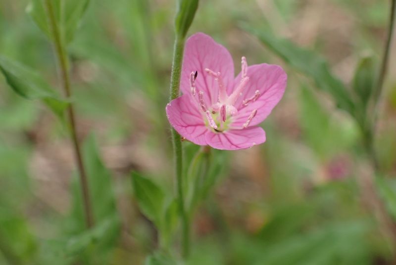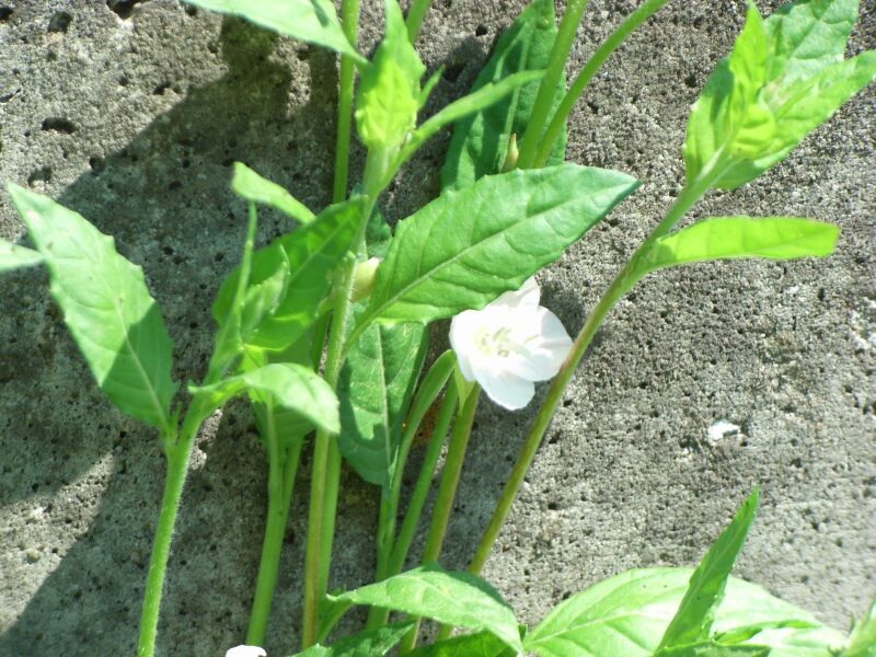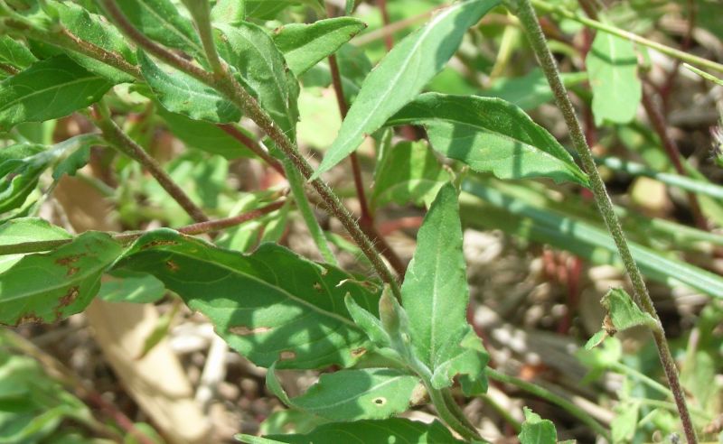 上部の葉腋に直径約1センチの淡紅色の4弁花を数個つける。