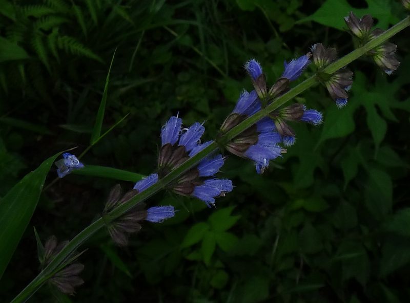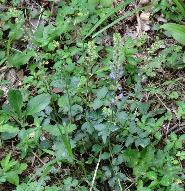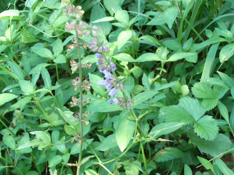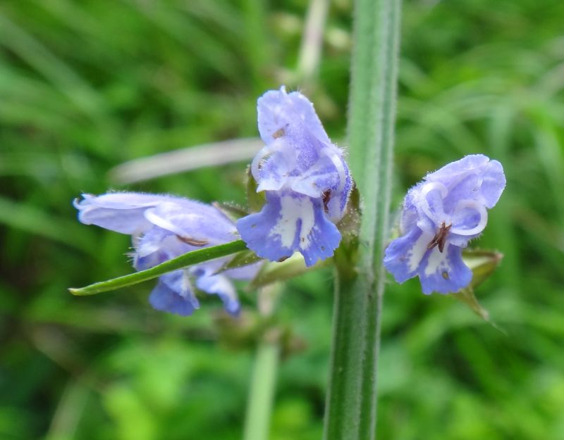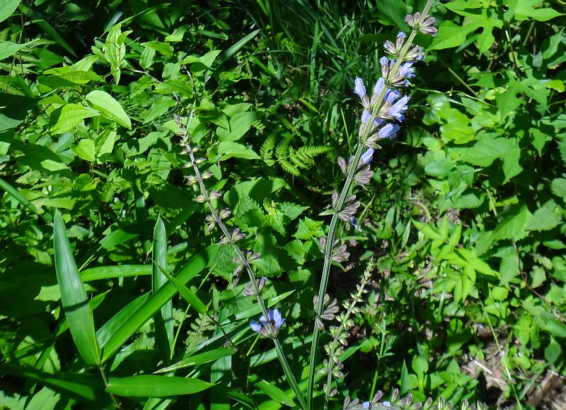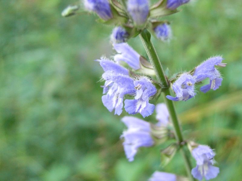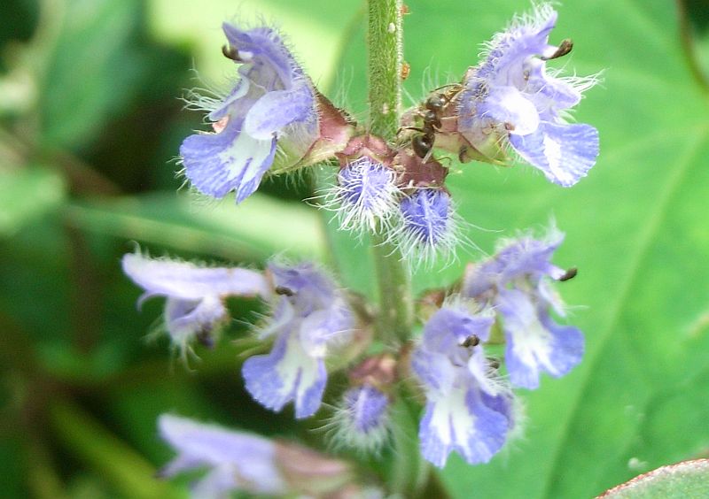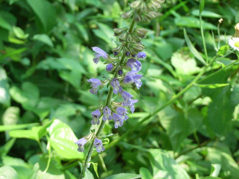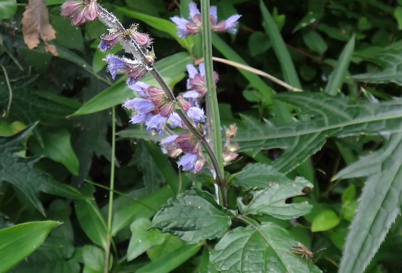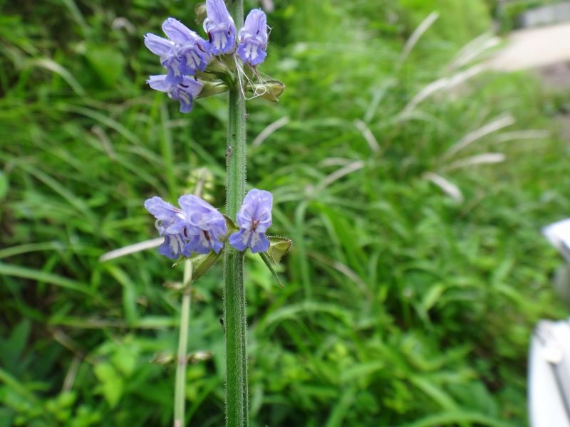 青紫色で唇形の花が間隔をおいて数段輪生するが、