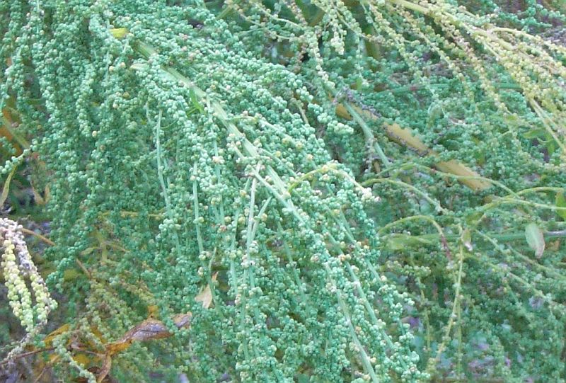 花穂に緑色の花がびっしり並ぶ。花序もよく枝分かれする。
