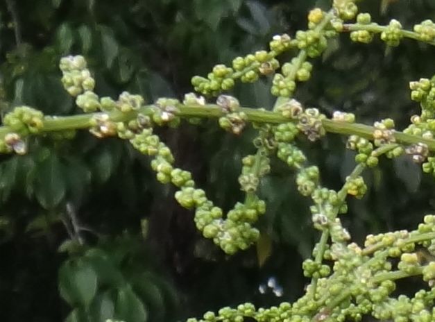 枝先に緑色の花穂を円錐状に多数つけ、両性花と小さな雌花を多数つける。
