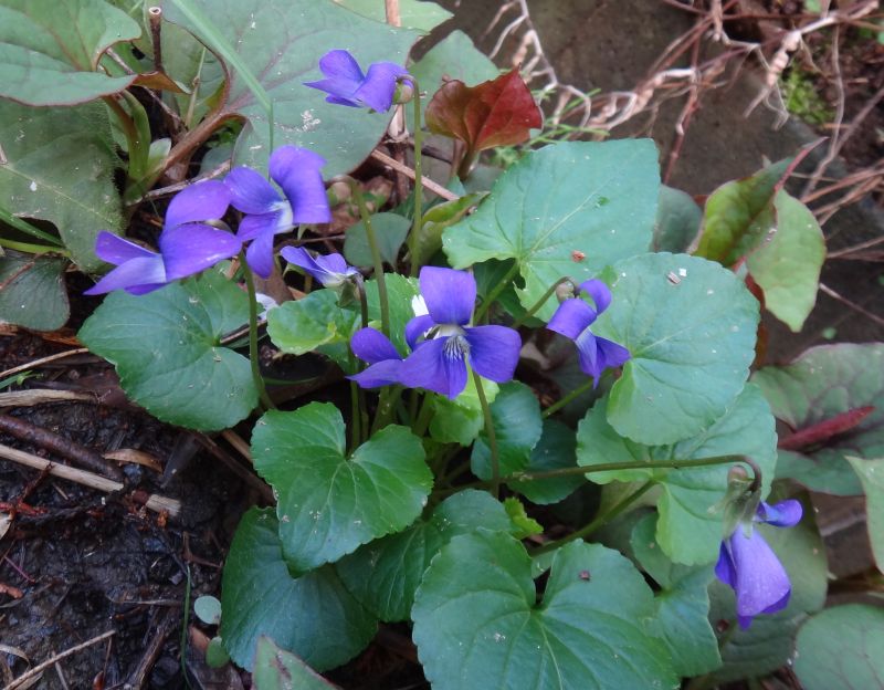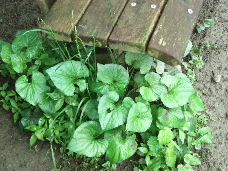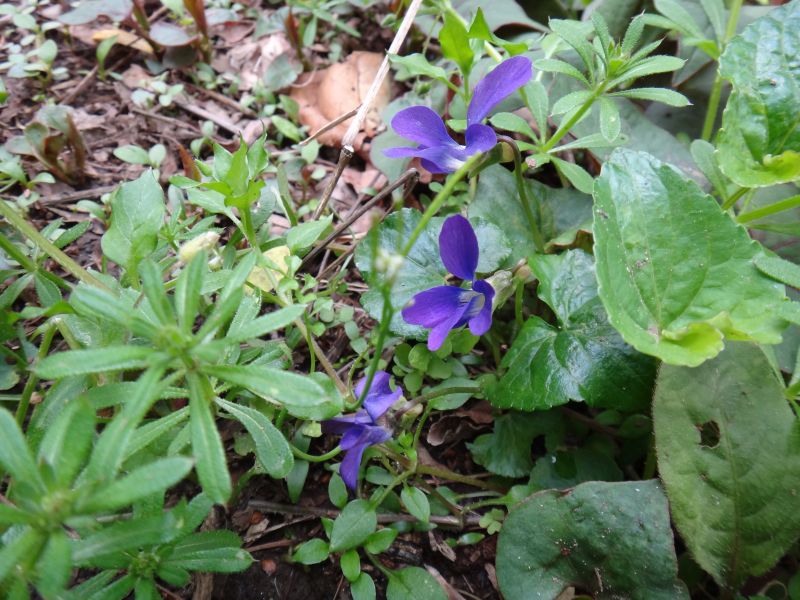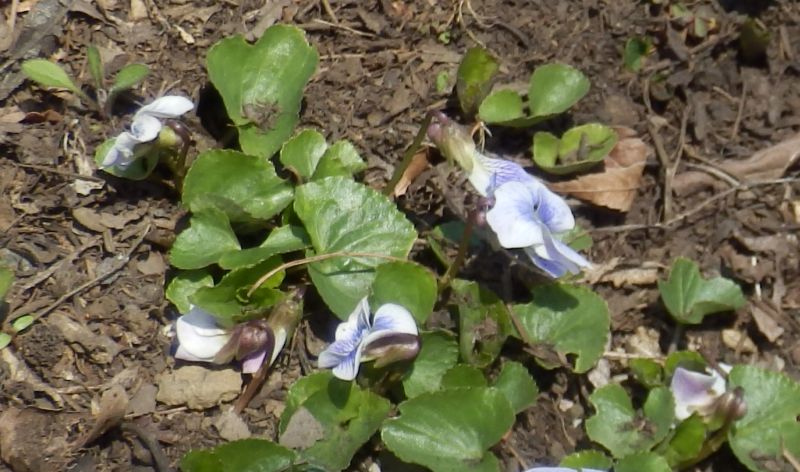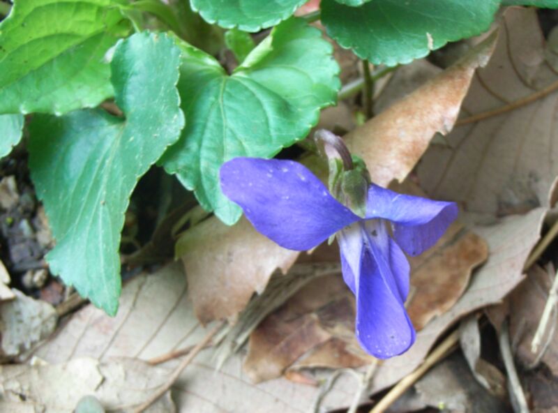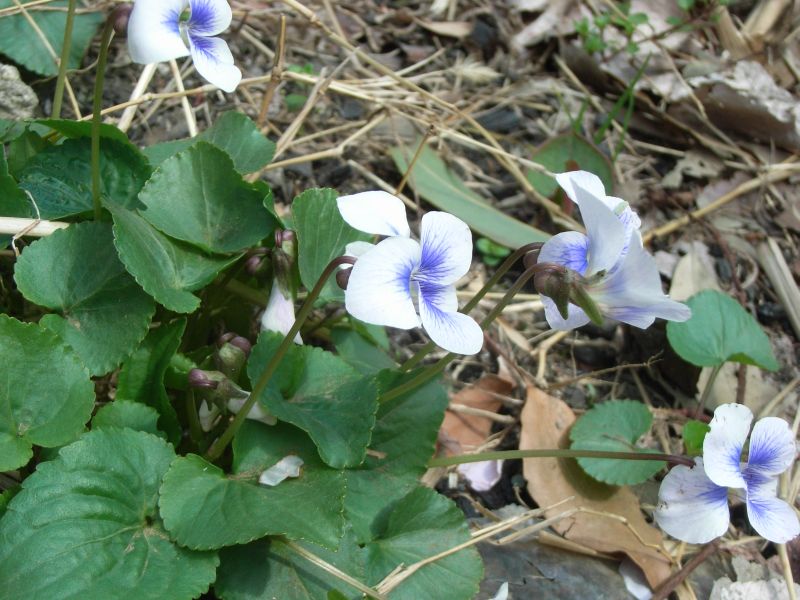 スミレサイシン :葉が心形、花は淡紫色、葉の展開途中で咲く。