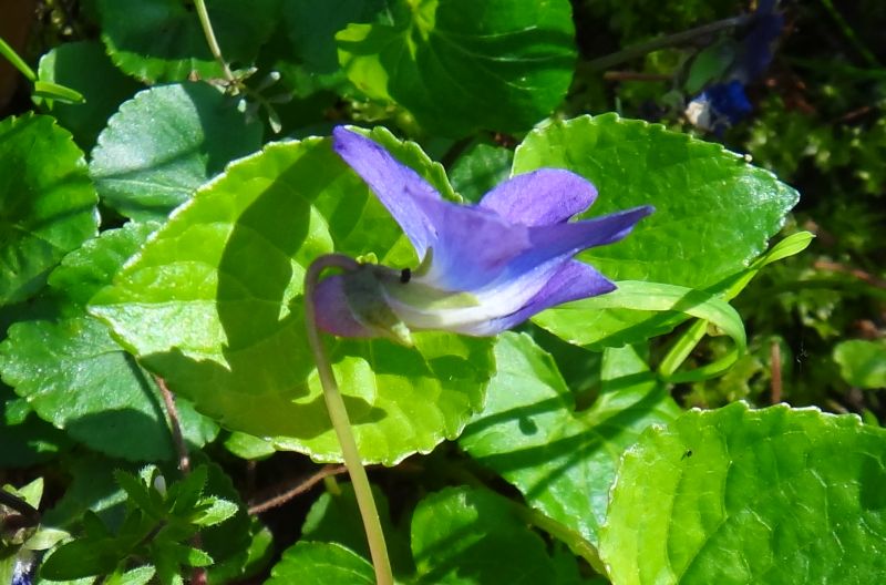 ナガバノスミレサイシン:葉が長3角状、花は淡紫色、葉の展開途中で咲く。