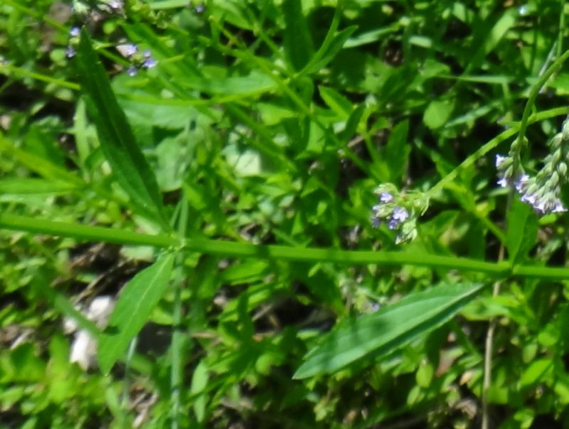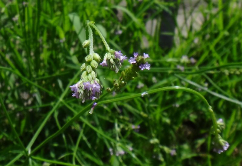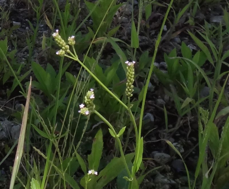 ダキバアレチハナガサ:葉の基部は中間と同じ幅、尾状の花穂が総状に集まる、茎に剛毛、高さ1.5メートル。