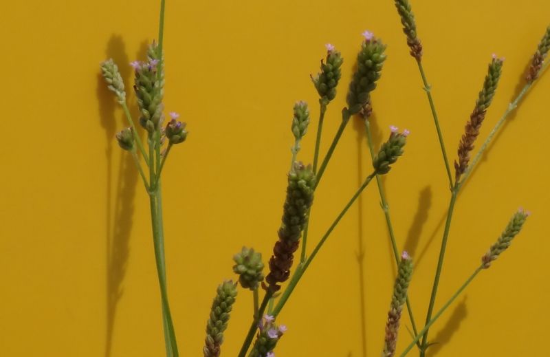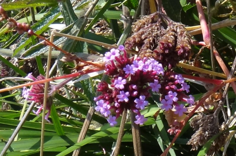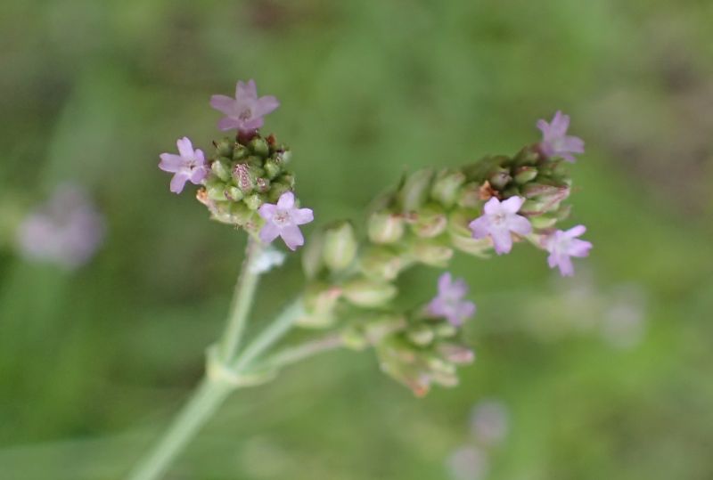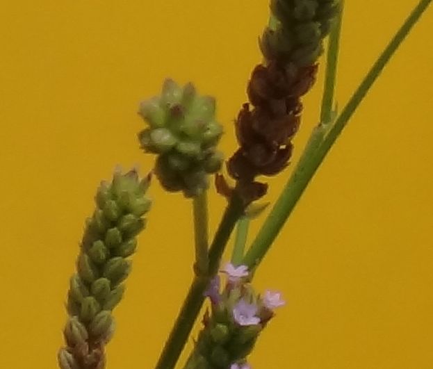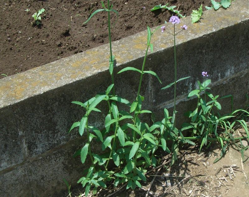 アレチハナガサ:葉の基部がくさび形に細くなる、花穂は散房状に集まる、茎の毛は短い、茎は中実、高さ1.5メートル。