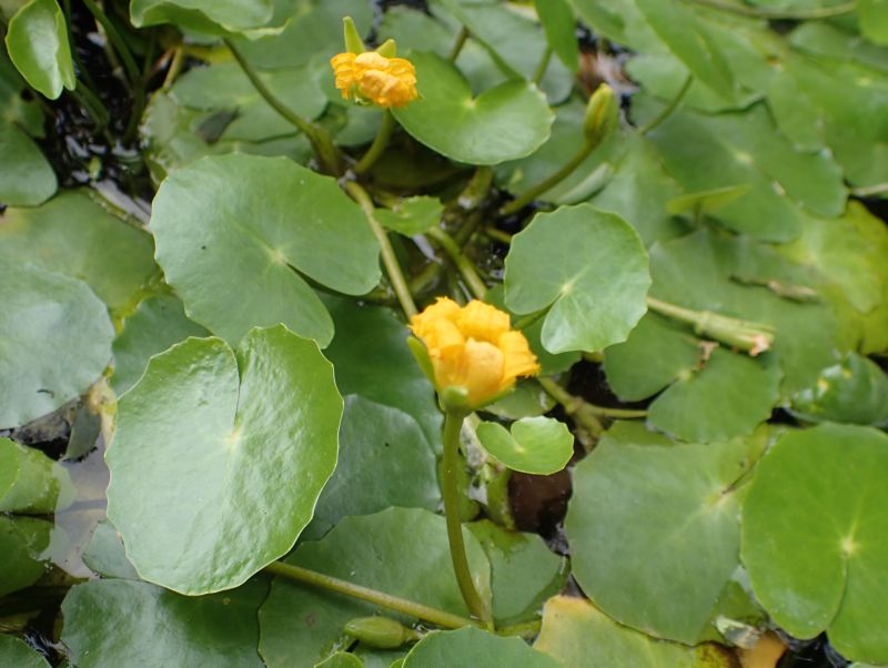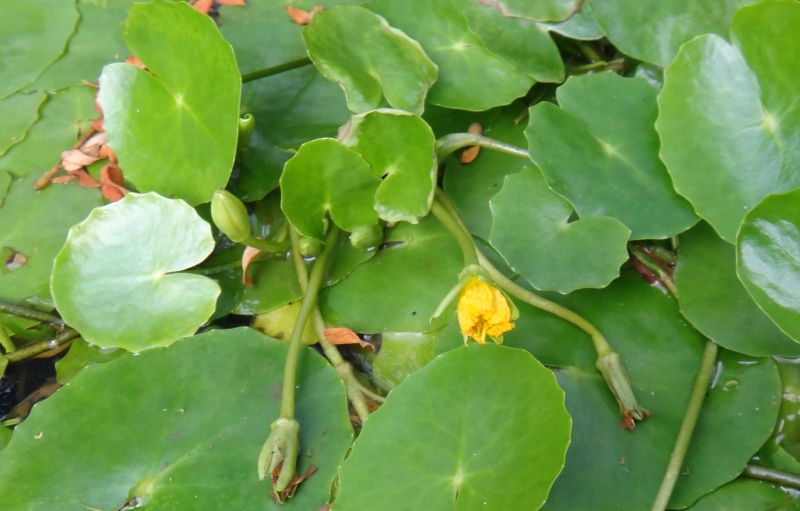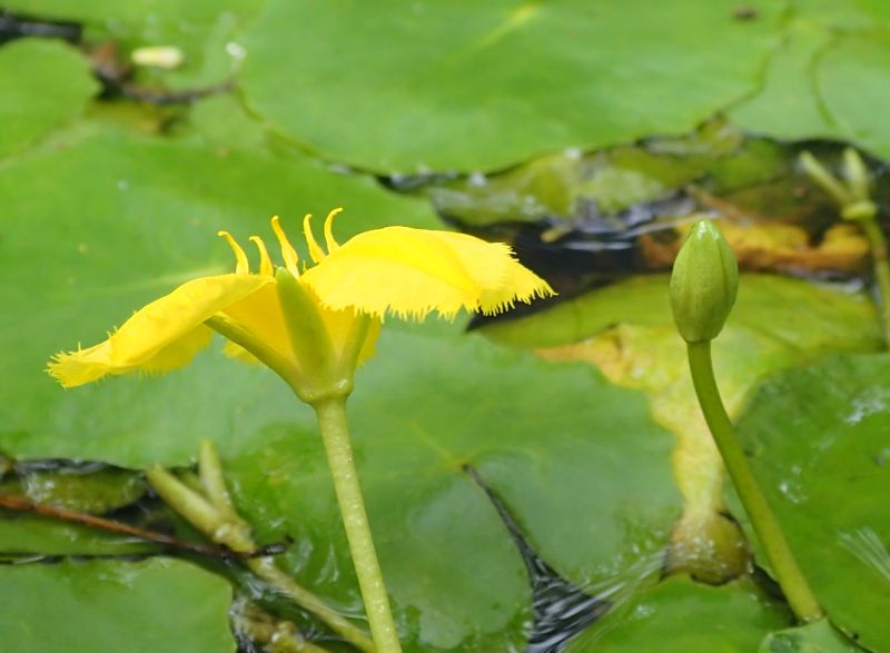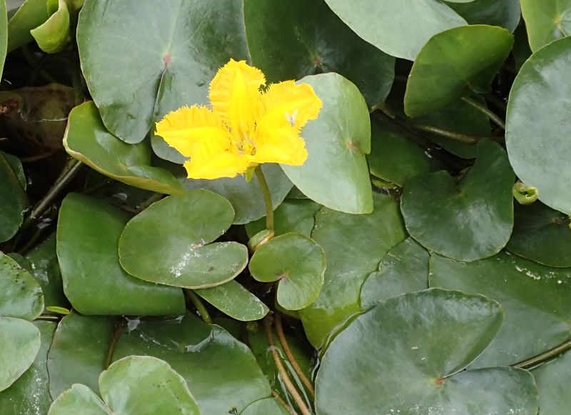 葉腋から花柄が伸びて水面より少し上に黄色い花が1つ咲く。
