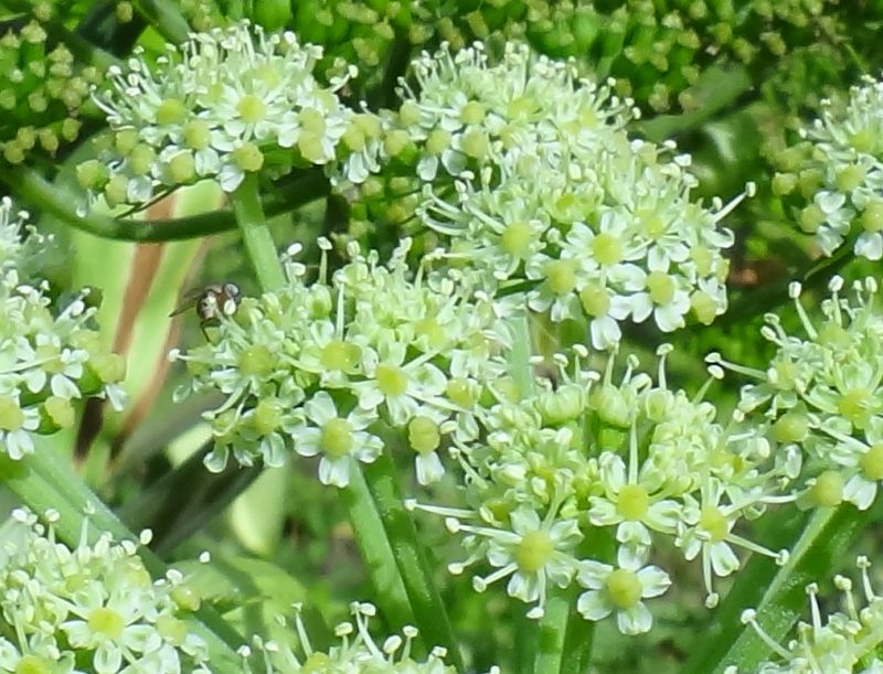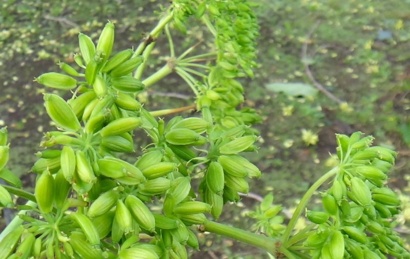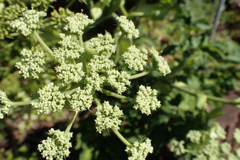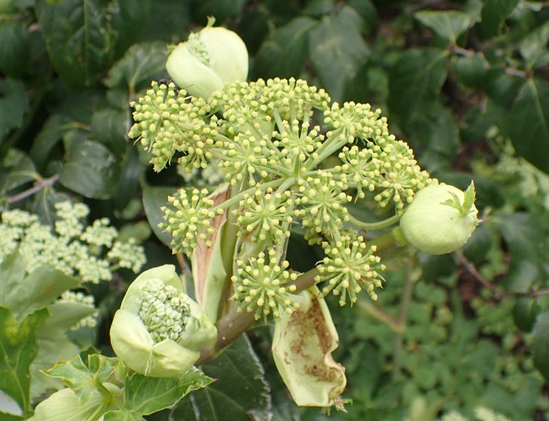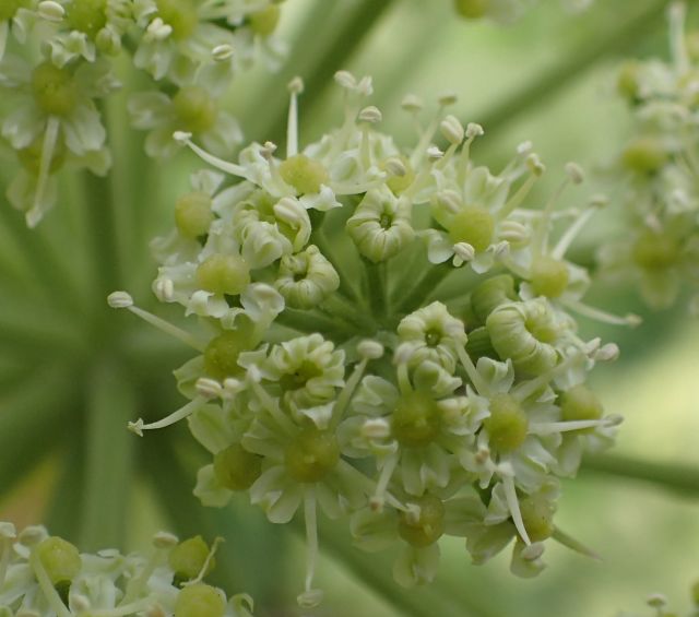 白〜淡黄緑色の複散形花序が出る。