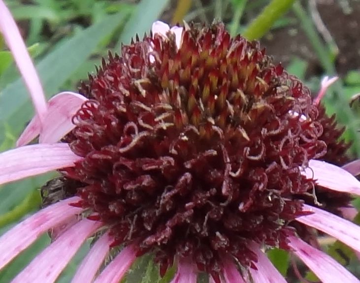 花の中央の筒状花が次第に紫褐色に盛り上がってくる。