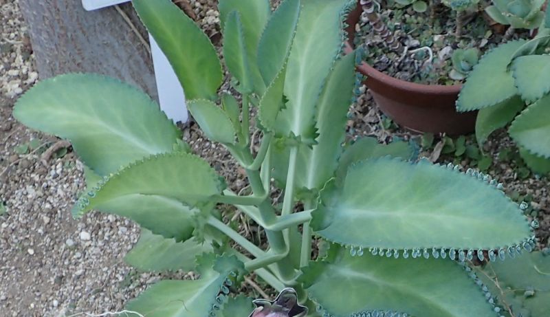 多肉質で長楕円形の葉の縁に不定芽をつけ、総状花序に先の5裂した釣り鐘形の花を下向きにつける