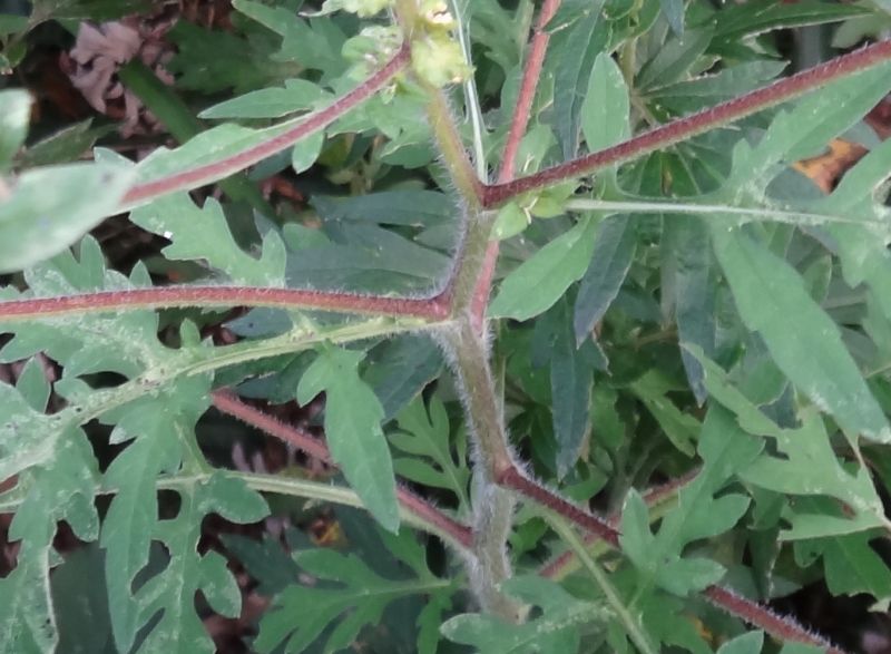 ブタクサ :高さ0.3〜1メートル、葉は2回羽状に深裂、裂片は細長い。