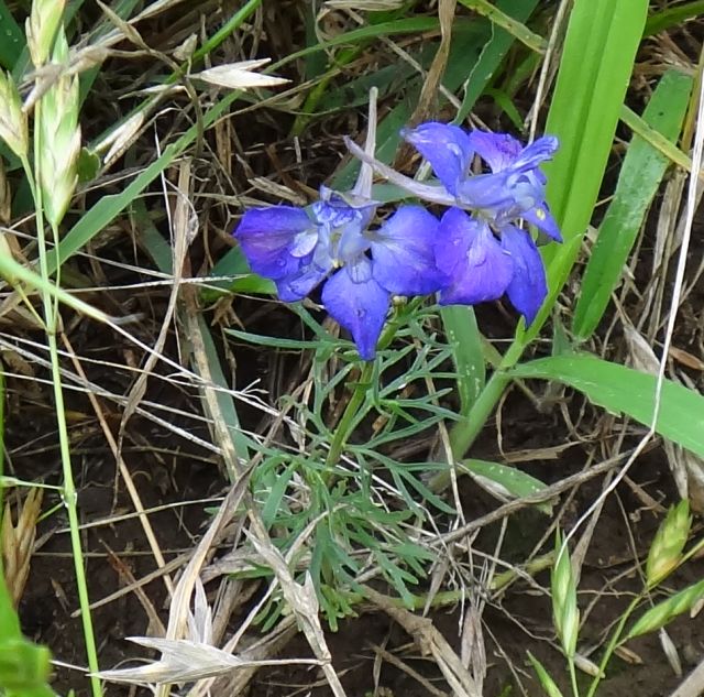 花の後ろに細長い距が突き出る。葉は糸状に裂ける。